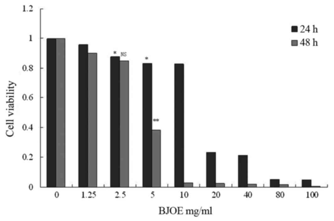 ECA109 cells in the logarithmic growth phase were inoculated in 96-well plates at a density of 5×103 cells/ml. The cells were cultured in an incubator containing 5% CO2 at 37°C. The medium was removed and replaced with fresh medium supplemented with different BJOE concentrations (1.25, 2.5, 5, 10, 20, 40, 80, and 100 mg/ml), when the monolayers had reached confluency. An untreated cell culture medium was used as an experimental control. After treatments were administered for 24 and 48 h, medium was removed, and cells were washed with PBS (pH 7.4), once or twice. Following this, 20 µl MTT (5 mg/ml; Beyotime Institute of Biotechnology, Haimen, China) was added to each well. After the medium was inoculated for another 4 h, the supernatant was removed and 150 µl dimethyl sulfoxide (Nanjing KeyGen Biotech Co., Ltd.) was added to each well to dissolve formazan crystals. Cell viability was determined through MTT cell proliferation and cytotoxicity assay (Beyotime Institute of Biotechnology). Absorbance was obtained at a wavelength of 490 nm using a microplate reader (Bio-Rad Laboratories, Inc., Hercules, CA, USA).