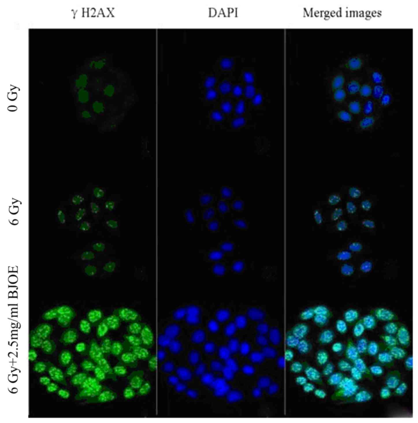 ECA109 cells were cultured on 6-well plates at a density of 5×104 cells/ml. The cells were treated with or without BJOE (2.5 mg/ml) and exposed to 6 Gy radiation. The control cells did not receive BJOE or radiation treatment. Each group was incubated under hypoxic conditions for 24 h. Thereafter, the cells were fixed with 4% paraformaldehyde for 15 min at 4°C, permeabilized with 0.3% Triton X-100 for 15 min at 4°C, and blocked with 1% bovine serum albumin for 2 h at room temperature (all from Nanjing KeyGen Biotech Co., Ltd.). The cells were incubated with an anti-γH2AX primary antibody (dilution, 1:250) at 4°C overnight and the following day with secondary antibody conjugated with FITC (dilution, 1:150) for 1 h at room temperature. The nuclei were counterstained with DAPI (Nanjing KeyGen Biotech Co., Ltd.) for 3 min. Focal formation was verified by using a laser scanning confocal microscope.