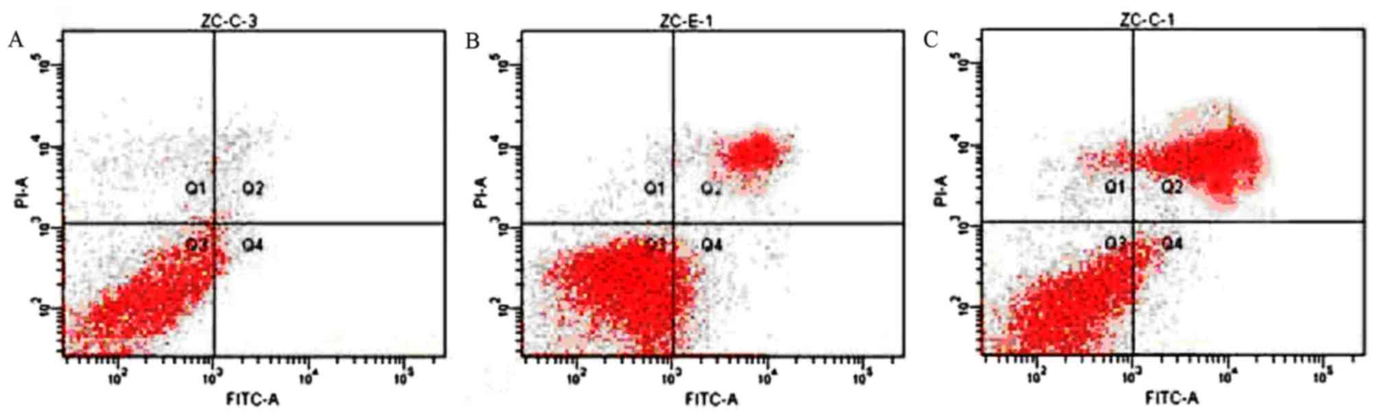 Single-cell suspension of ESCC cells lines were seeded onto 6-well plates at a density of 5×106 cells/ml. The control group was cultured under hypoxic conditions for 24 h without any treatment. The two groups were treated with 6 Gy irradiation and cultured for 24 h under hypoxic conditions. They were further cultured for 48 h. The cells were routinely trypsinized, rinsed with cold PBS, resuspended in 1X Annexin-binding buffer and stained with the Annexin V-flourescein isothiocyanate FITC apoptosis kit (Nanjing KeyGen Biotech Co., Ltd.), according to the manufacturer's protocol. The samples were immediately analyzed by using a flow cytometer. Data was analyzed using FlowJo 7.6.2 (FlowJo LLC, Asland, OR, USA).