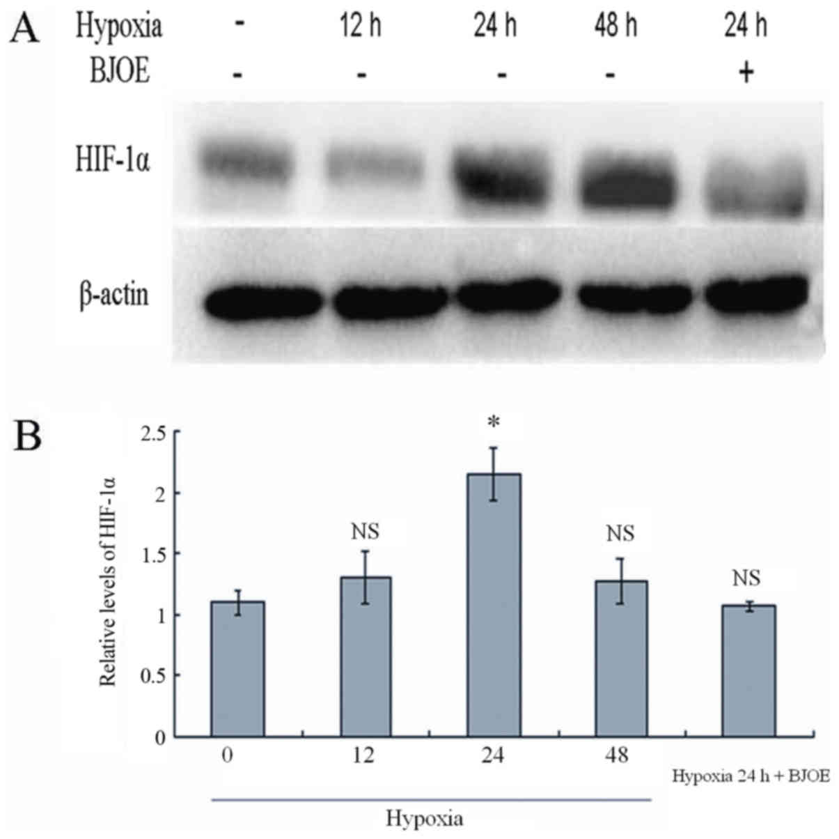 The HIF-1α expression in ESCC cells was analyzed by western blotting at different time points under hypoxic conditions (Fig. 5). Comparable to normal protein levels were detected after 12 h under hypoxic conditions. However, HIF-1α levels increased to the maximum in ECA109 cells after 24 h under hypoxic conditions. In response to treatment with 5 mg/ml BJOE for 24 h under hypoxic conditions, the HIF-1α protein levels in ECA109 cells were markedly inhibited by BJOE.