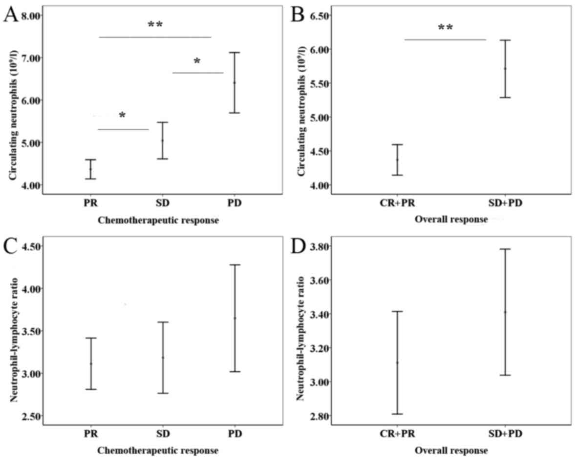 Sato H, Tsubosa Y and Kawano T: Correlation between the pretherapeutic neutrophil to lymphocyte ratio and the pathologic response to neoadjuvant chemotherapy in patients with advanced esophageal cancer. World J Surg. 36:617–622. 2012. View Article : Google Scholar : PubMed/NCBI
