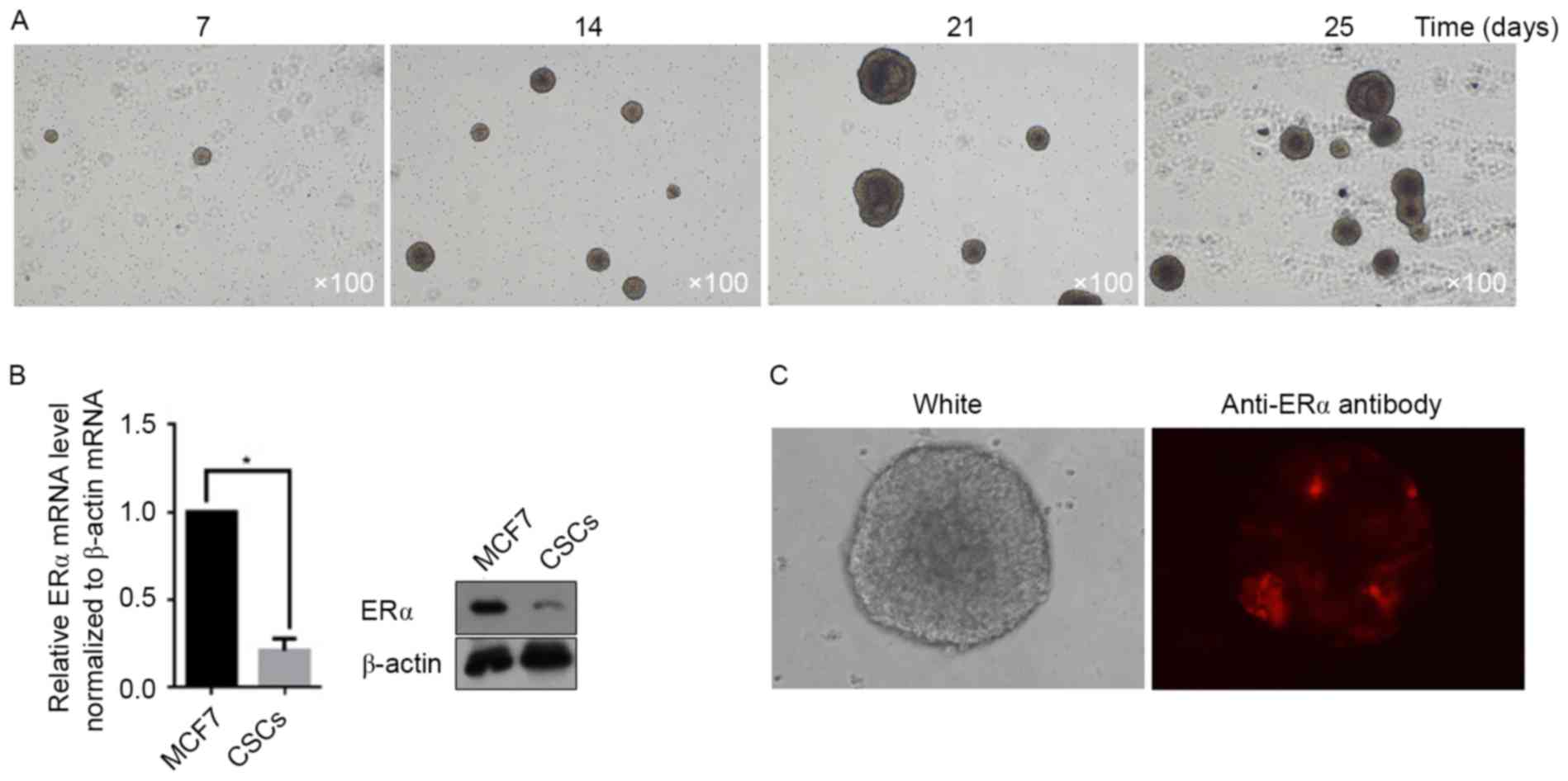 To isolate the CSC subpopulation from MCF7 cells, 1×106 MCF7 cells were incubated in Dulbecco's modified Eagle's medium/Ham's F12 supplemented with B27, bFGF and EGF for 25 days. Images were taken at days 7, 14, 21 and 25. As presented in Fig. 1A, the CSC spheres rapidly increased in size. Owing to the presence of ERα on the surface of MCF7 cells, the potential for CSCs derived from MCF7 to express ERα was examined. According to the RT-qPCR and semi-quantitative western blot assays, the total amount of mRNA and protein from ERα in CSCs decreased markedly when compared with that in MCF7 cells (Fig. 1B). In order to determine whether the decrease in ERα mRNA and protein levels occurred in each CSC, immunofluorescent staining was utilized to demonstrate the ERα-positive cells in spheres. As presented in Fig. 1C, a small section of ERα-positive CSCs in the sphere was detectable, whereas further cells exhibited an ERα-negative status.