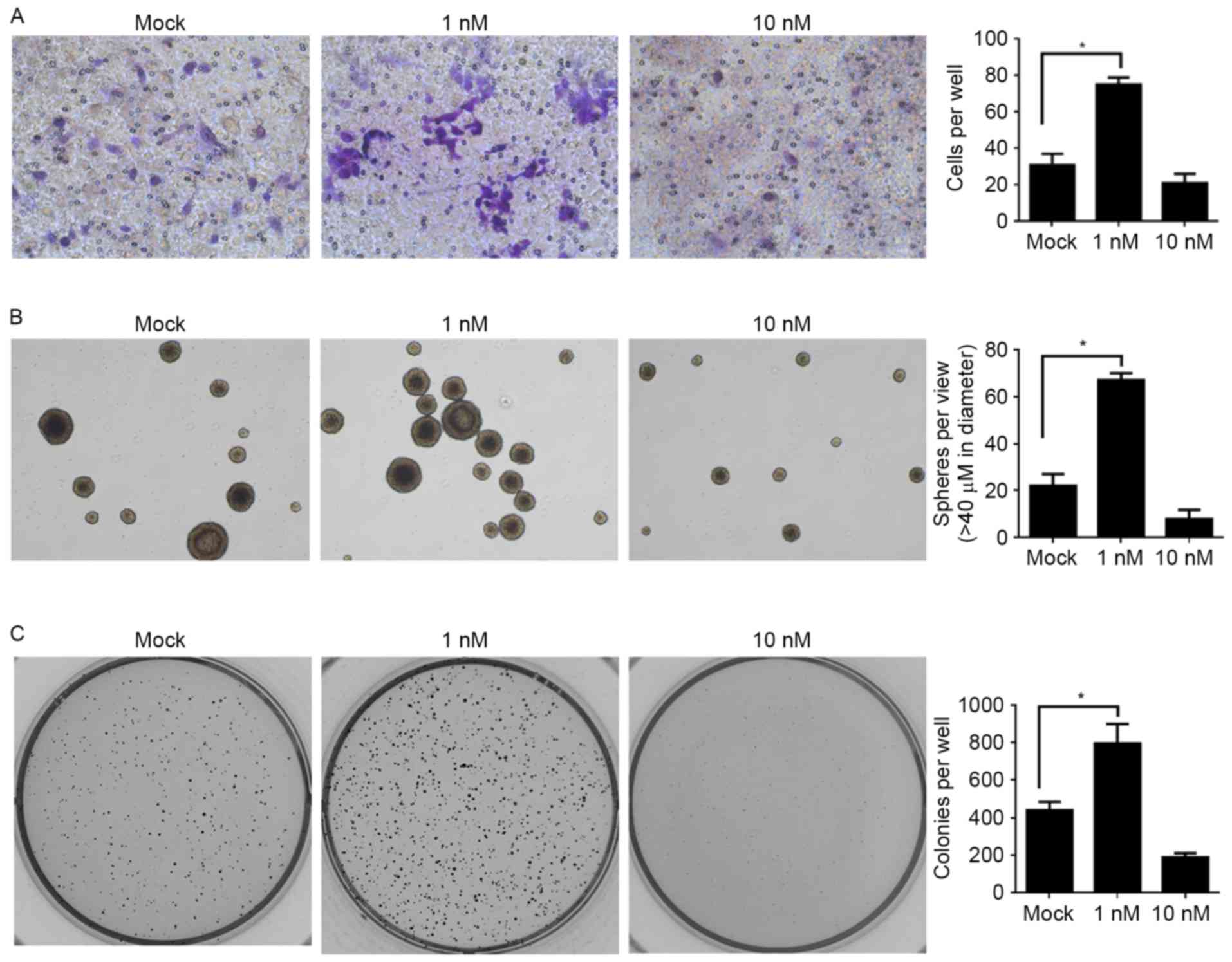 Because of the fatal effects of 50 nM E2 treatment, 10 nM E2 treatment was employed for further investigation of migration, self-renewal capacity and colony formation. It was observed that 10 nM E2 treatment universally inhibited these processes, whereas 1 nM E2 treatment had an opposing effect on them (Fig. 3).