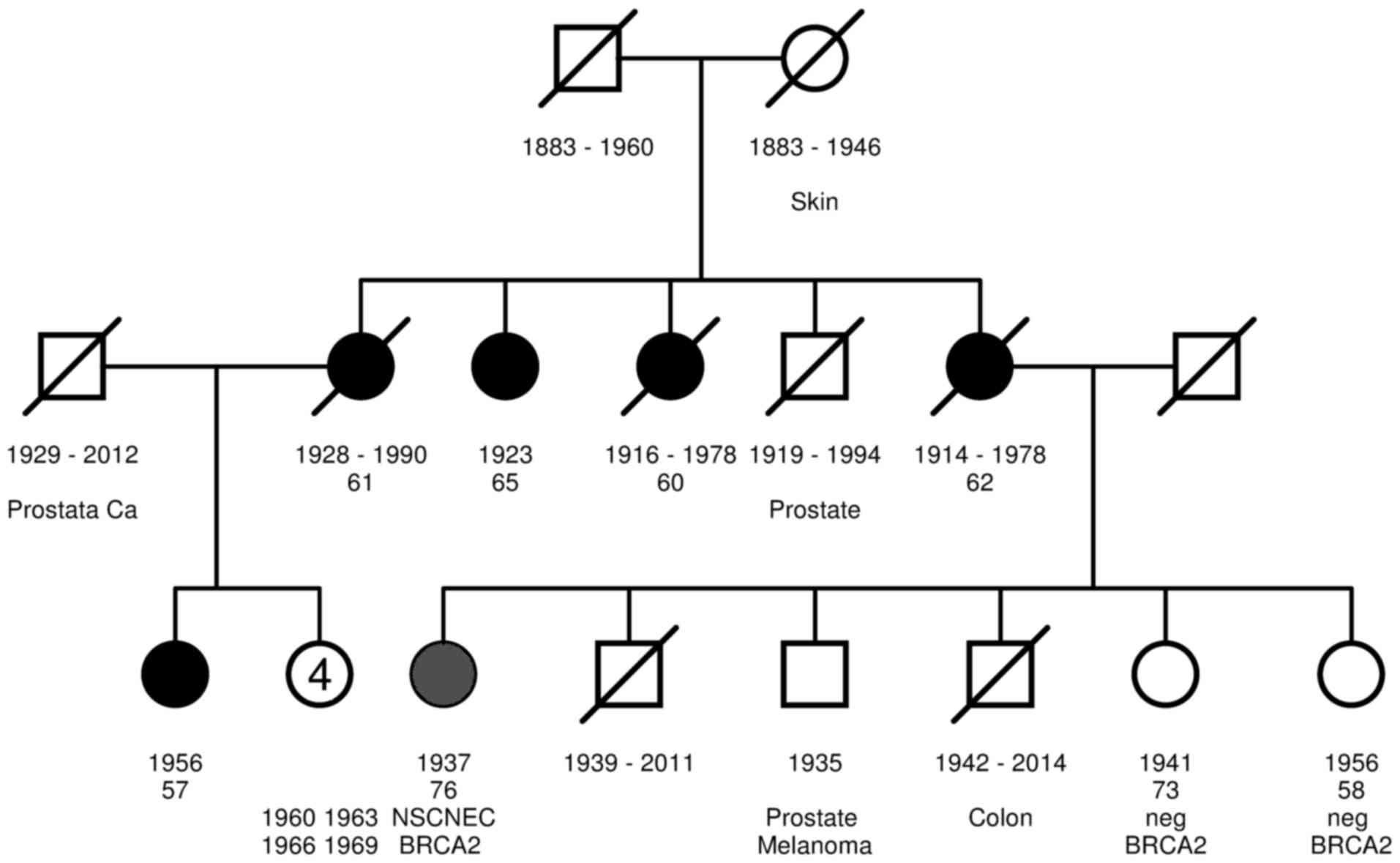 In the current case, a heterozygous germline mutation, BRCA2 exon 17, c.7976G>A, p.(Arg2659Lys), was identified in the family's index case, the female cousin diagnosed with breast cancer at the age of 57. The mutation was classified as >99% pathogenic (class 5) according to the IARC system (21) and functional analyses of the Evidence-based Network for the Interpretation of Germline Mutant Alleles consortium, which comprises genetic data of the GC-HBOC database (20,22). The patient with NSCNEC was identified to be a heterozygous carrier of the family's pathogenic germline mutation in BRCA2. No further pathogenic germline mutations were identified using the TruRisk® genepanel.