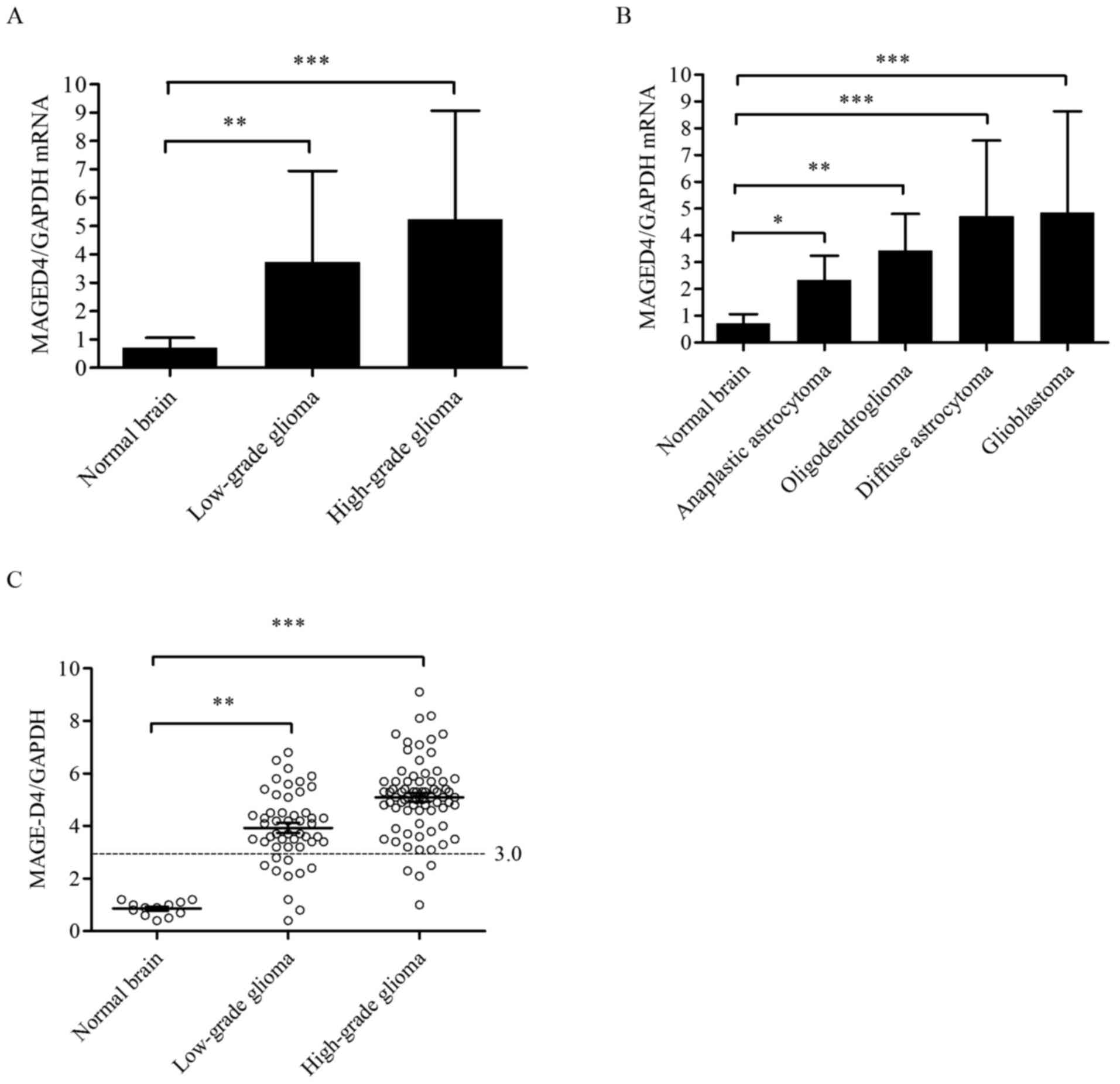 Total RNA extraction from frozen tissues and RT-qPCR were performed as previously described (18). Briefly, total RNA, which was derived from glioma tissues and normal brain specimens, was prepared using TRIzol® (Gibco; Thermo Fisher Scientific, Inc., Waltham, MA, USA). Then RNA was reverse transcribed into cDNA with RevertAid™ First Strand cDNA Synthesis kit (Fermentas, USA), according to the manufacturer's instructions. Primers of MAGE-D4 (19) and glyceraldehyde-3-phosphate dehydrogenase (GAPDH) (20) were obtained from Applied Biosystems (Thermo Fisher Scientific, Inc.). The forward primer sequence for MAGE-D4 was 5′-CCAGCTTCTTCTCCTGGATC-3′ and the reverse primer sequence was 5′-GTAACACTGATACCCAAAACATG-3′. The forward primer sequence for GAPDH was 5′-GCACCGTCAAGGCTGAGAAC-3′ and the reverse primer sequence was 5′-TGGTGAAGACGCCAGTGGA-3′. qPCR was performed in a 20 µl total reaction volume using SYBR® Premix Ex Taq™ II kit (Takara Biotechnology Co., Ltd.) on the ABI Prism 7900 sequence detection system (Applied Biosystems; Thermo Fisher Scientific, Inc.). The cycling parameters were as follows: Initial denaturation at 95°C for 10 min, followed by 40 cycles at 95°C for 15 sec, and annealing and extension at 60°C for 1 min. Dissociation curves were performed to confirm specific product amplification. MAGE-D4 mRNA expression was standardized to that of GAPDH mRNA. All samples were tested in triplicate. Expression levels for samples were demonstrated as MAGE-D4 values standardized to the MAGE-D4/GAPDH ratio. The relative number of target transcripts was normalized to the number of human GAPDH transcripts in the same sample. The relative quantitation of target gene expression was performed using the standard curve or quantification cycle method (21).
