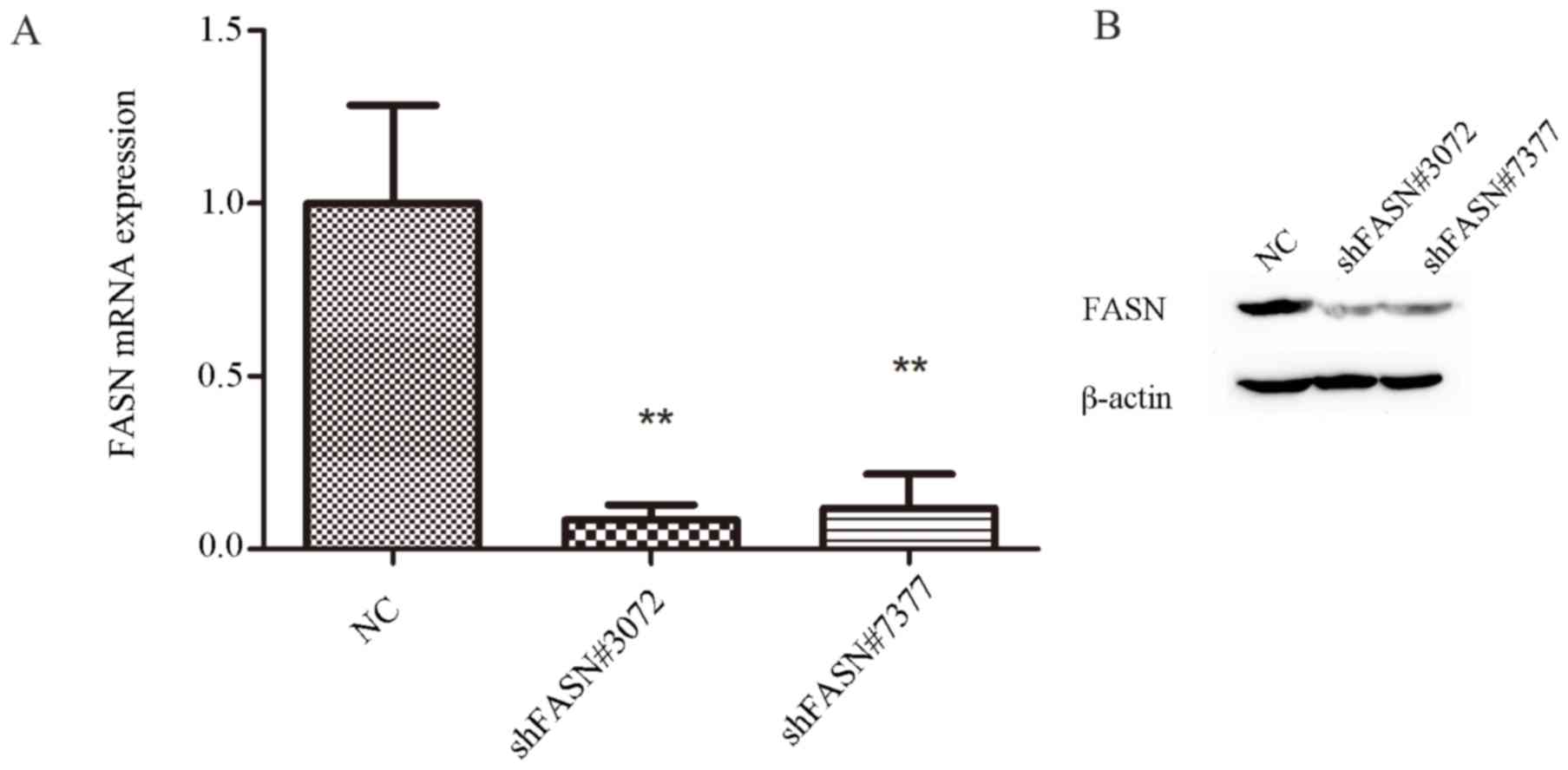 To assess the role of FASN in A549 cells, FASN expression was knocked down using a lentivirus-mediated shRNA approach, and the FASN mRNA and protein expression levels in transfected cells were evaluated using RT-qPCR and western blot analysis. The results of RT-qPCR analysis revealed that FASN mRNA levels were suppressed by ~92 and 88% in the cells that were transfected with shFASN#3072 and shFASN#7377, respectively. FASN mRNA was significantly decreased in shFASN#3072 and shFASN#7377-transfected cells compared with the negative control (NC) group (P<0.01; Fig. 1A). The RT-qPCR results were consistent with the results of the western blot analysis (Fig. 1B), which revealed that the expression of FASN protein in cells transfected with shFASN#3072 or shFASN#7377 was markedly diminished compared with the NC group. These data suggested that the lentivirus-mediated shRNA system was able to successfully inhibit the expression of FASN in A549 cells.