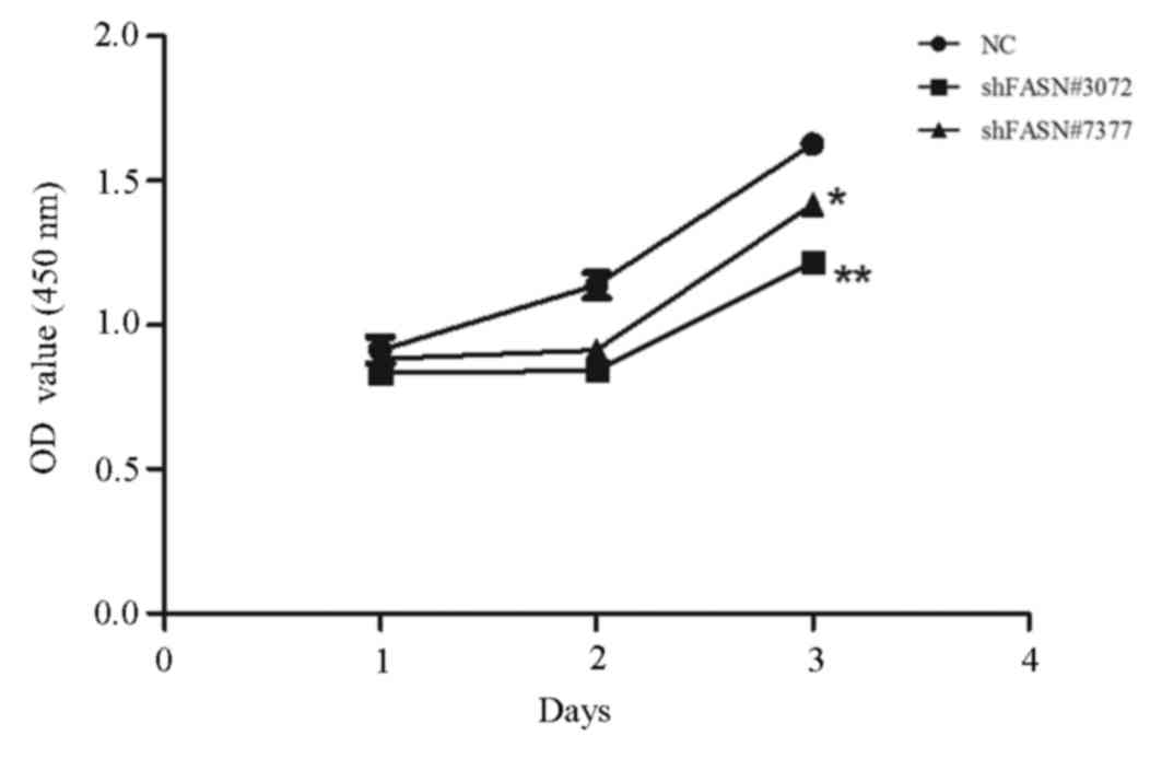 The effect of FASN knockdown on cell proliferation was investigated using a CCK-8 assay. After 1, 2 and 3 days, the absorbance values of the cells that were transfected with FASN-shRNA#3072 and FASN-shRNA#7377 revealed that proliferation was significantly inhibited in these groups compared with the NC group. The proliferation rates of shFASN#3072- and shFASN#7377-transfected cells at 24, 48 and 72 h were decreased by 16, 29 and 27% (shFASN#3072; P<0.01), and 18, 17 and 17% (shFASN#7377; P<0.05), respectively (Fig. 2).