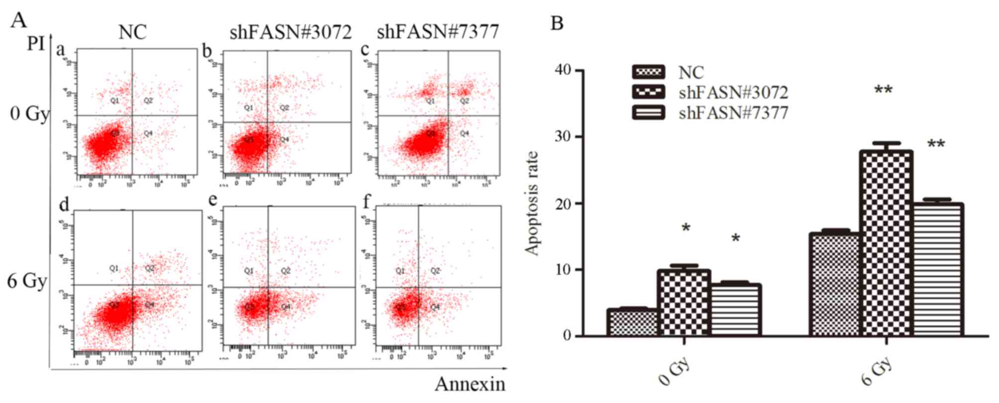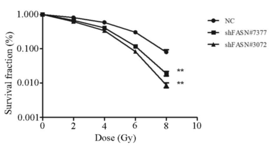 To address the fact that a decrease in apoptosis may lead to long-term resistance to radiotherapy, a colony formation assay was conducted in the present study, revealing that transfection with shFASN led to the formation of considerably fewer colonies compared with the control group. This indicates that the knockdown of FASN is able to markedly enhance cell susceptibility to irradiation. At the same time, this demonstrated that a combination of shFASN and ionizing radiation reduced clonogenic survival compared with each treatment alone.