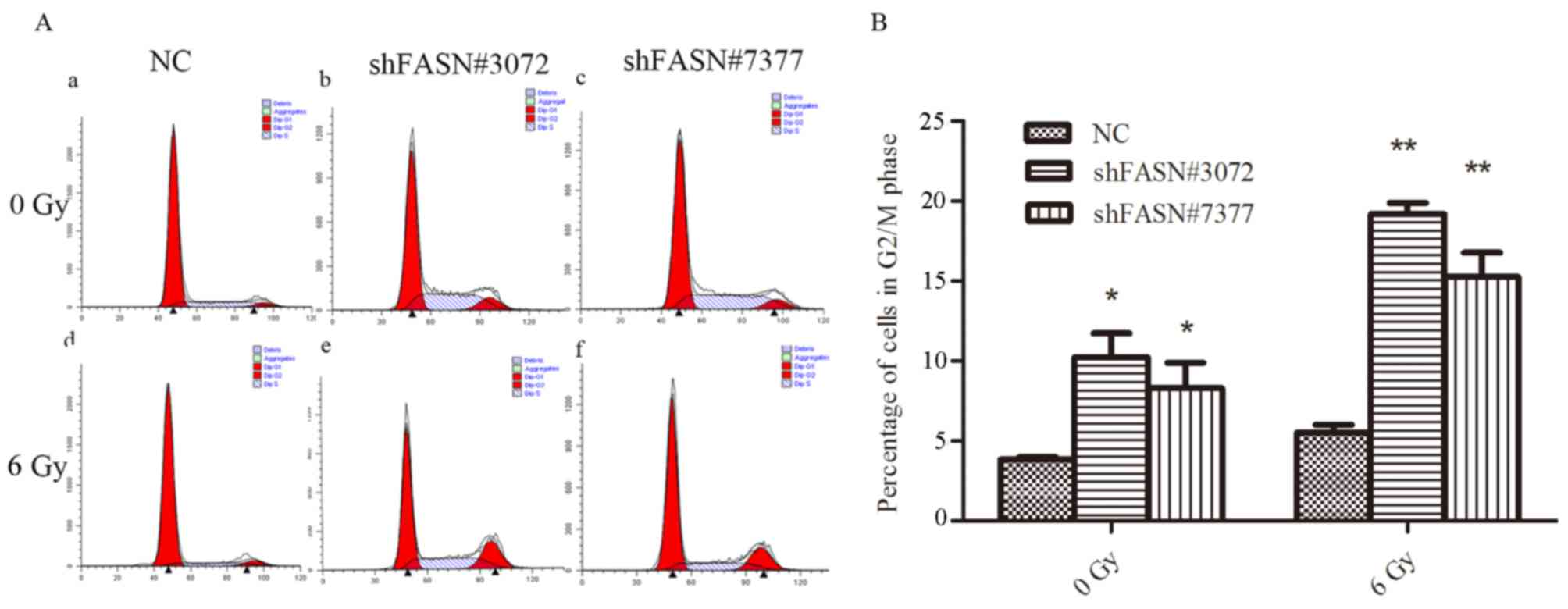 Although the expression of FASN is upregulated in various types of cancer, its association with radiosensitivity in NSCLC is not well understood. Therefore, the aim of the present study was to construct an effective short hairpin RNA (shRNA) to knockdown FASN in an NSCLC cell line (A549), and to measure the effect of this on cell proliferation, the cell cycle and apoptosis, in addition to assessing radiosensitivity by the analysis of clone formation and DNA repair proteins.