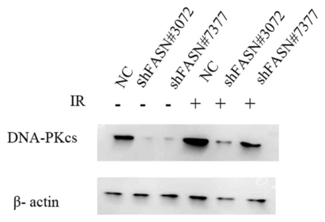 To analyze whether the inhibition of FASN may affect radiosensitivity, the expression levels of DNA-PKcs protein, a key protein associated with the repair of DNA DSBs, following exposure to 6 Gy irradiation were analyzed. As indicated in Fig. 6, the downregulation of FASN expression suppressed the levels of DNA-PKcs and inhibited the increase in the levels of these proteins following irradiation. These results indicated that FASN-mediated radioresistance may be associated with the expression of the DNA DSB repair protein DNA-PKcs.