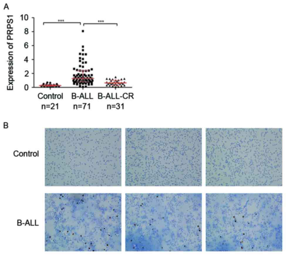 IHC staining to detect the protein expression and distribution of PRPS1 in B-ALL and control patients revealed that the staining for PRPS1 in the BM was stronger in the B-ALL patients compared with that in the control group (Fig. 1B), which was consistent with the RT-qPCR data.