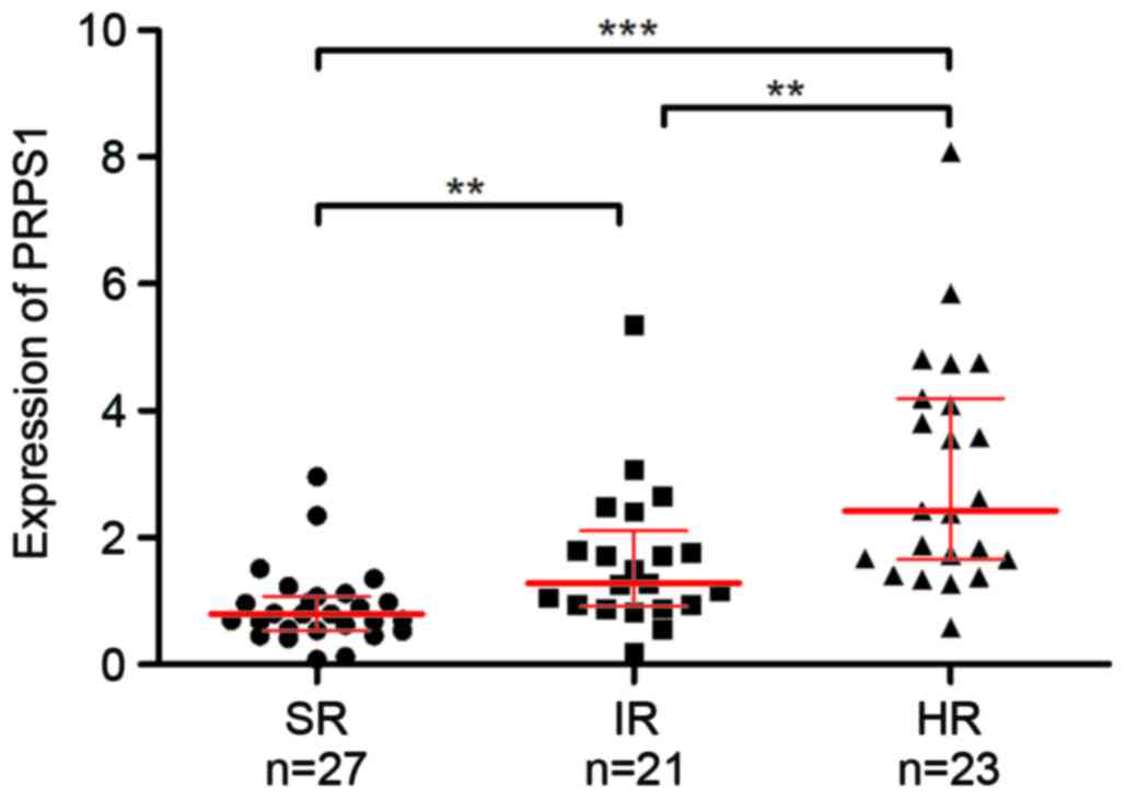 The risk factors for B-ALL patients include an elevated peripheral white blood cell (WBC ≥50×109/l) count, age (infant or ≥10 years old), recurrent chromosomal abnormalities and poor response to initial therapy (2). Depending on these risk factors, the patients were categorized into the standard risk, intermediate risk and high-risk groups, according to the CCLG ALL2008 guidelines (18), and were treated with chemotherapy accordingly. Analysis of PRPS1 in these subgroups revealed a significant difference in PRPS1 levels between each of the three risk groups of patients with B-ALL (Fig. 2 and Table III), and PRPS1 expression was significantly increased in patients with higher risk stratification. These results indicated that PRPS1 expression was associated with risk stratification in B-ALL.
