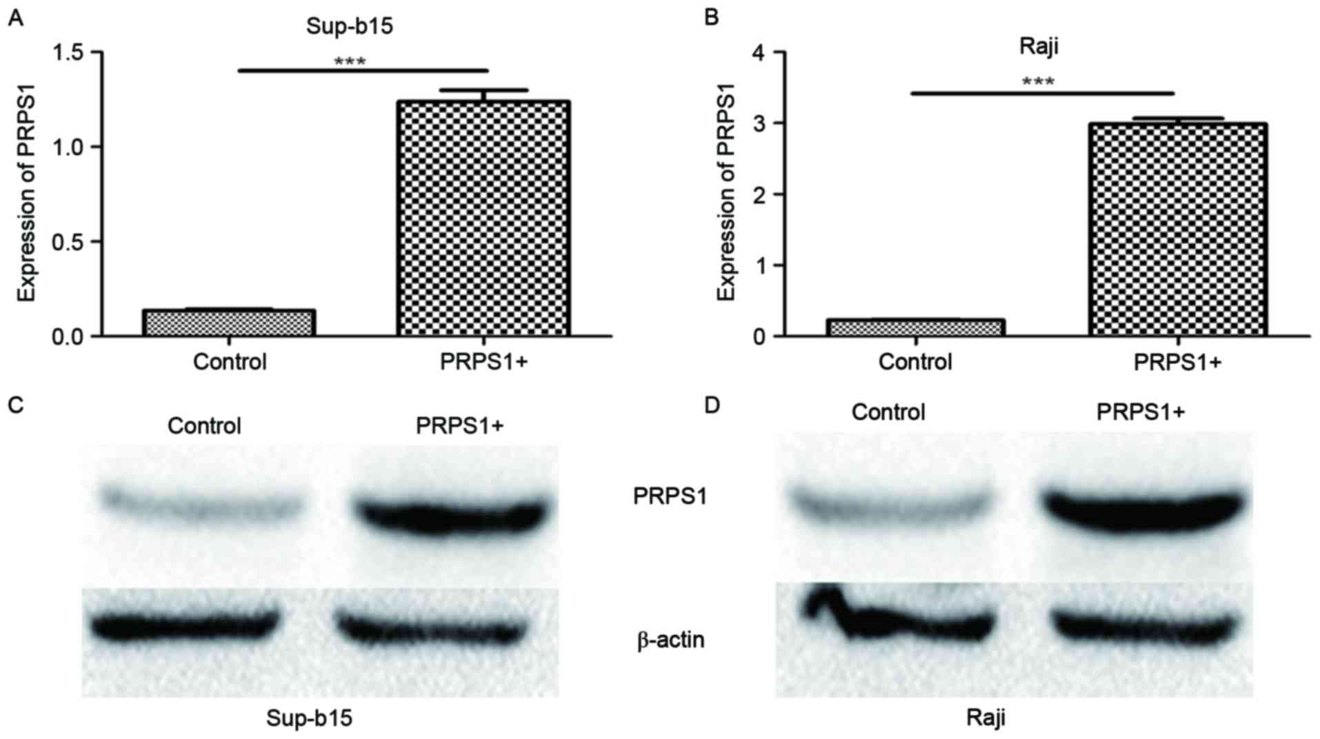 To investigate the function of PRPS1 in the leukemogenesis of B-ALL further, the B-ALL cell lines Sup-B15 and Raji were transfected with lentivirus particles containing the PRPS1-overexpressing vector. The increased PRPS1 expression was confirmed by RT-qPCR and western blot analysis to be significant in these cells (P<0.05; Fig. 3).