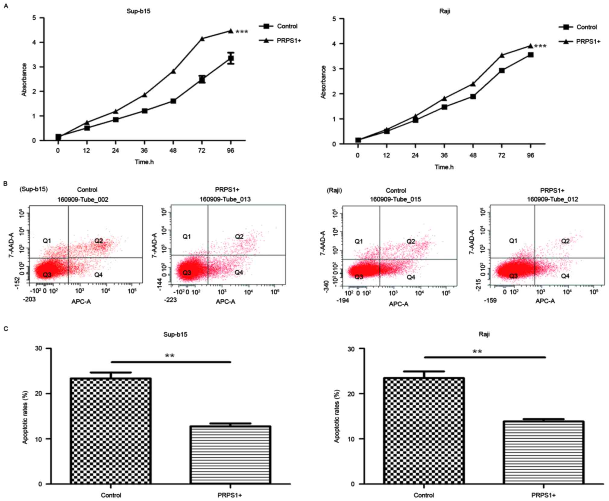 To examine the effect of PRPS1 overexpression on ALL cell behaviors, cell proliferation (Fig. 4A) and annexin V-APC/7AAD staining assays (Fig. 4B and C) were performed on Sup-B15 and Raji cells. The results of the cell proliferation assay revealed that the proliferation of cells overexpressing PRPS1 was significantly increased compared with cells that did not overexpress PRPS1 (P<0.05; Fig. 4A), which indicated that PRPS1 overexpression significantly increased the proliferation of B-ALL cells. Furthermore, the results of the annexin V-APC/7AAD flow cytometry assay (Fig. 4B) demonstrated that, compared with the control groups, cells overexpressing PRPS1 exhibited a decrease in apoptosis (P<0.05; Fig. 4B and C). The phase distributions of the cell cycle were detected; however, the results did not show any significant differences between the cells overexpressing PRPS1 and the control cells at any of the phases (Table IV). When accounting for the results in all assessed cell lines, PRPS1 overexpression decreased the apoptosis of B-ALL cell lines and thus inhibited the growth of cells, but this exogenous expression did not affect the distribution of cells in different phases of the cell cycle.