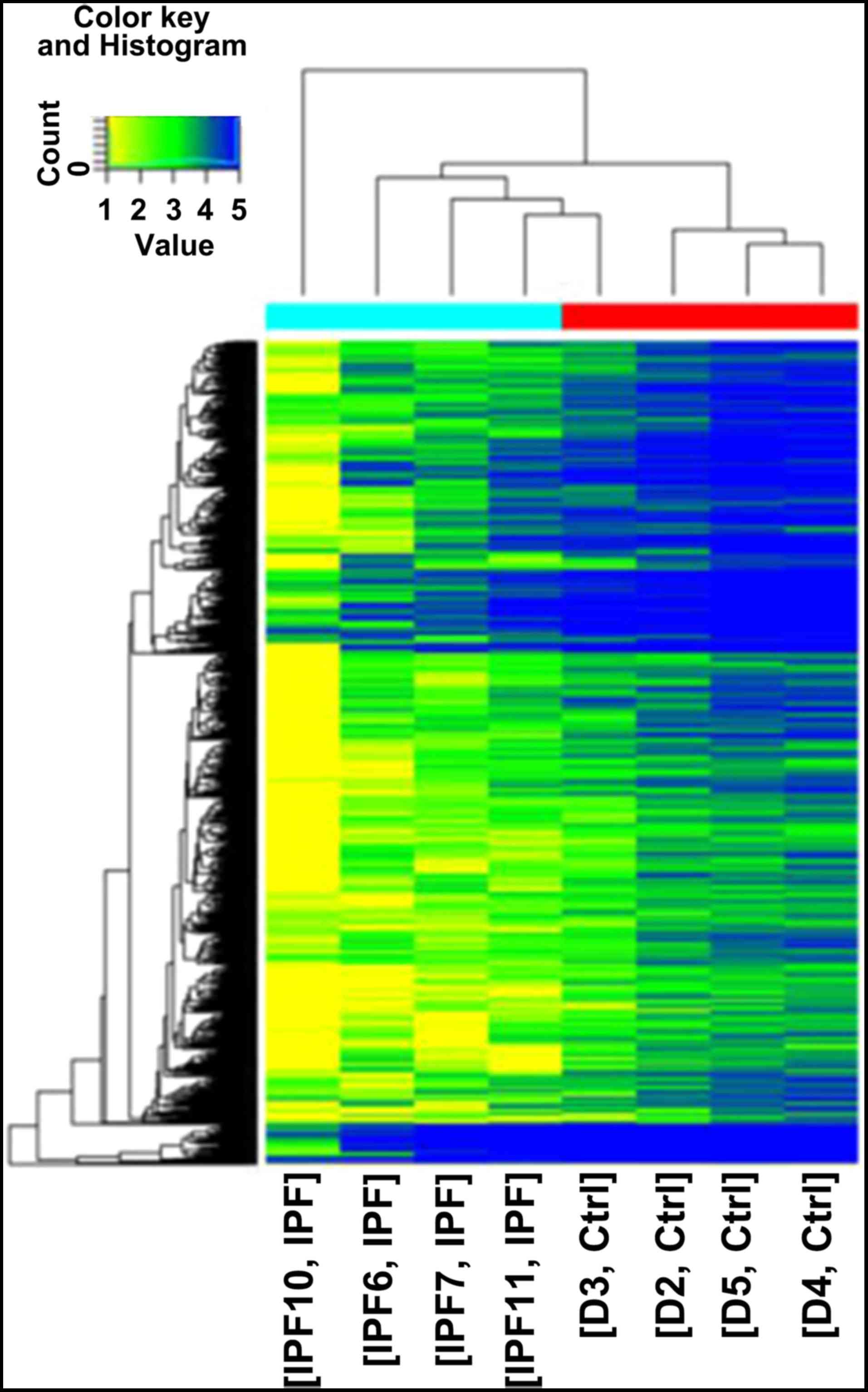 Studies have demonstrated that lncRNA alterations and the p53-signaling pathway are involved in the process of IPF, and lung cancer formation. Therefore, it was hypothesized that there are certain changes in lncRNA related to the p53 gene, further associating IPF with lung cancer. Thus, the present study aimed to investigate the differential expression of lncRNAs through high-throughput sequencing and bioinformatics analysis.
