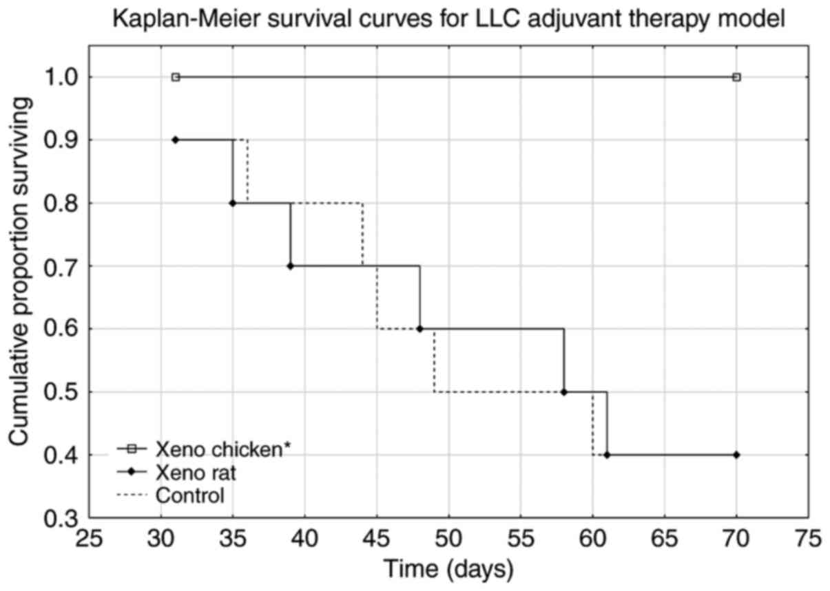 A total of 30 C57BL/6 female mice were subcutaneously injected with 3×105 LLC cells in the left hind-foot, and all of the mice developed visually detectable tumours at the injection site. On day 14, the foot with the primary tumour was surgically resected. No surgery-associated causalities were recorded. The mice were subsequently treated with either the xeno rat vaccine (n=10) or the xeno chicken vaccine (n=10) or injected with saline solution (n=10).