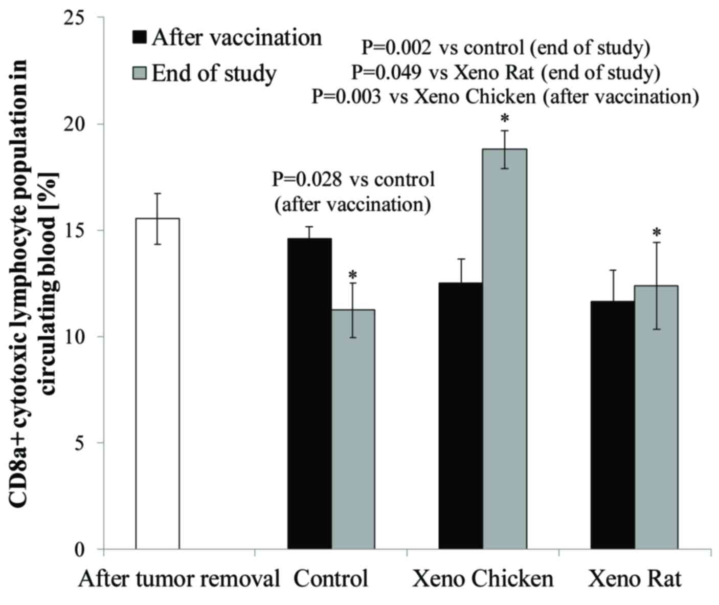 The long-surviving xeno chicken vaccination group was characterized by the highest proportion of CD8a+ in circulating blood from all investigated groups (18.8% of T lymphocytes vs. 12,4% in Xeno Rat and 11,2% in control groups). This was a larger percentage compared with the value reported in a previous study (39), where a value of 16.6% CD8+ T lymphocytes was reported for an autologous lysate-based vaccine, which was considered to be clinically successful. The strong statistical correlation between the mean survival time and CD8a+ population size in the present study (r=0.985) indicates that cytotoxic T-lymphocytes may be a pivotal element in the vaccine-induced antitumour immune response, which is in agreement with data from the literature (40–44).