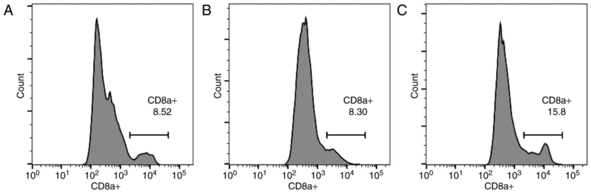 For analysis of CD8a+ T cell population, 100 µl blood were collected from the hip vein from each mouse. Whole blood was stained with anti-CD8-phycoerythrin (PE) (cat no. 552877; BD Biosciences, Franklin Lakes, NJ, USA) and anti-CD3-allophycocyanin (APC) (cat no. 553066, BD Biosciences) antibodies (1 µl/100 µl blood, 25 min incubation at room temperature). Erythrocytes were lysed using ACK Lysing buffer (Gibco; Thermo Fisher Scientific, Inc.). For FACS, 20,000 events were collected using BD FACSDiva™ 7.0 flow cytometer (BD Biosciences) and analyzed with FlowJo™ (version 10.2; FlowJo LLC, USA) software.