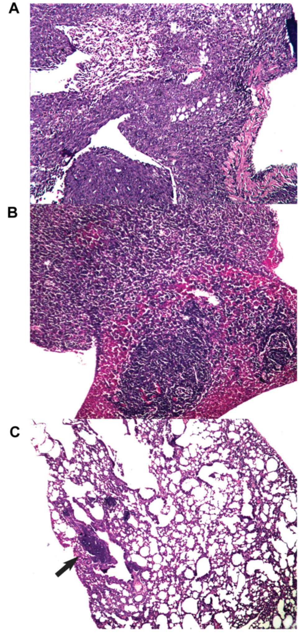 The metastatic LLC model was introduced in the present study since the handling of oncological patients following primary tumour removal remains a challenge in modern oncology (37,38). Lungs were primarily investigated for metastatic spread owing to the known characteristic of the LLC cell line, which spreads preferentially to lung tissue (30).