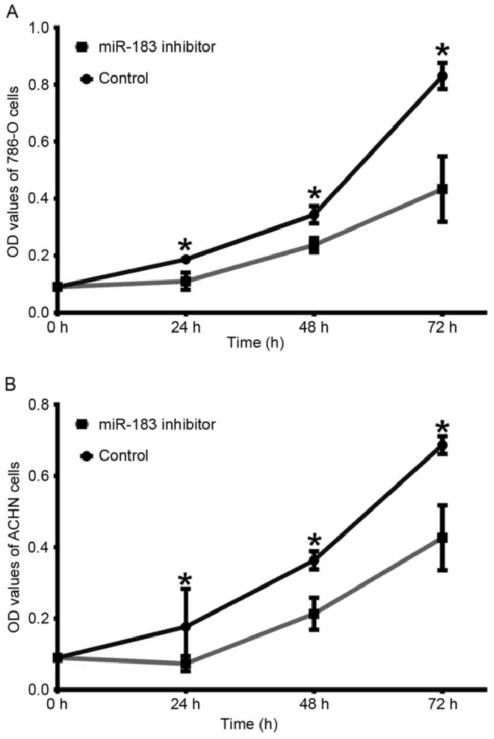 In order to determine whether miR-183 was able to affect RCC cell proliferation, an MTT assay was performed. Following transfection with the miR-183 inhibitor, the proliferation of 786-O cells was decreased by 7.67% (24 h; P<0.05), 10.67% (48 h; P<0.05) and 39.67% (72 h; P<0.05) compared with the negative control group (Fig. 3A). In the ACHN cells, cell proliferation was decreased by 11.33% (24 h; P<0.05), 15.00% (48 h; P<0.05) and 26.00% (72 h; P<0.05) compared with the negative control group (Fig. 3B). These results suggested that downregulation of miR-183 may inhibit RCC cell viability.