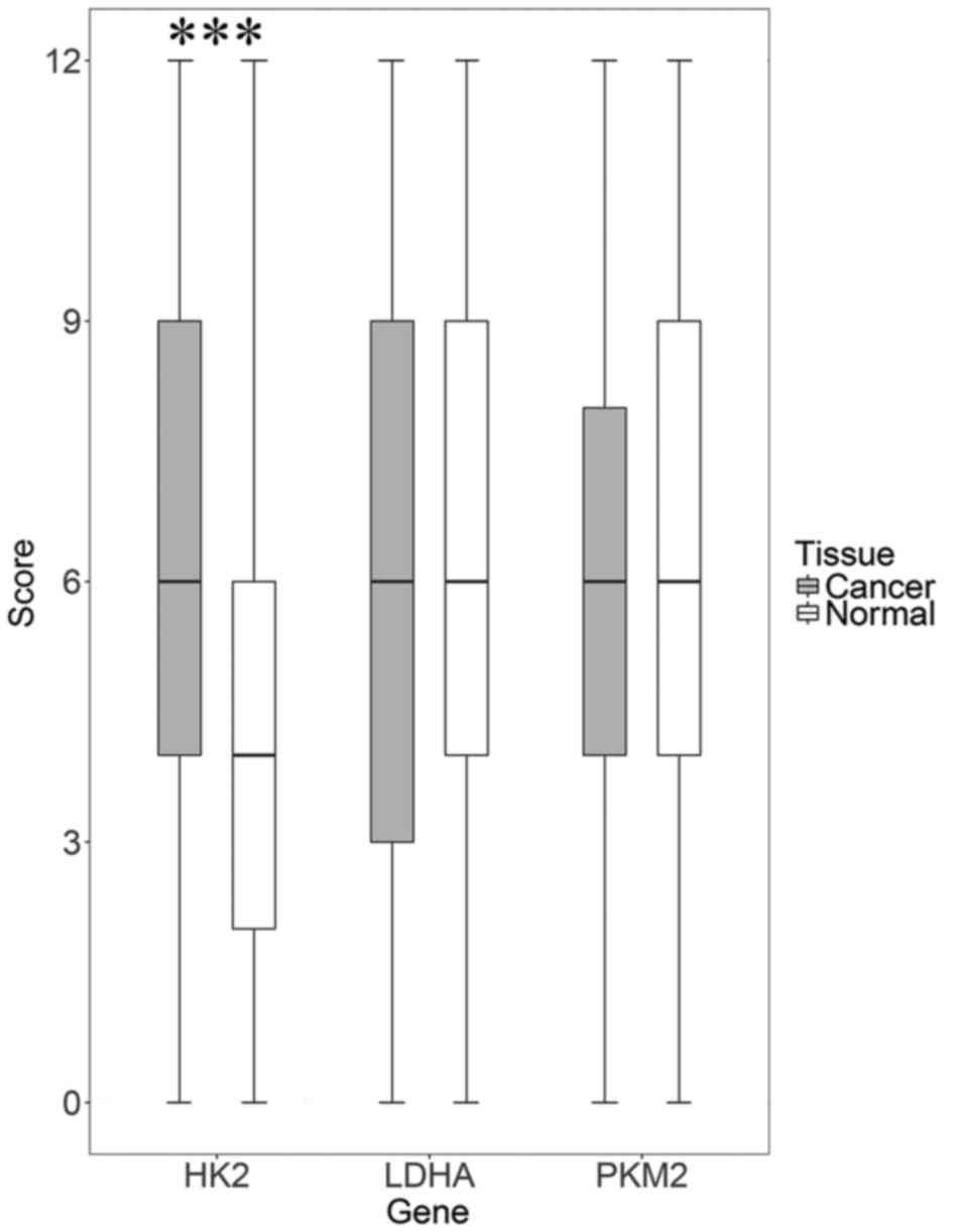 Protein expression was evaluated by two individuals using an Olympus CX31 microscope (Olympus, Center Valley, PA). The mean percentage of positive tumor cells was determined from five areas at magnification, ×400 and assigned a 0–100% value. The intensity of immunostaining was scored as follows: negative, 0; weak, 1; moderate, 2; and intense, 3. For the percentage of positive tumor cells, the score was classified as 0–4 (10%, 11–25%, 26–50%, 51–75%, >75%). Thus, the percentage of positive tumor cells and the staining intensity were multiplied to produce a total score for each sample. Then, the total HK2 and PKM2 scores were categorized as low expression (≤3) and high expression (>3) (13). The total scores for LDHA were categorized as low expression (<6) and high expression (≥6).