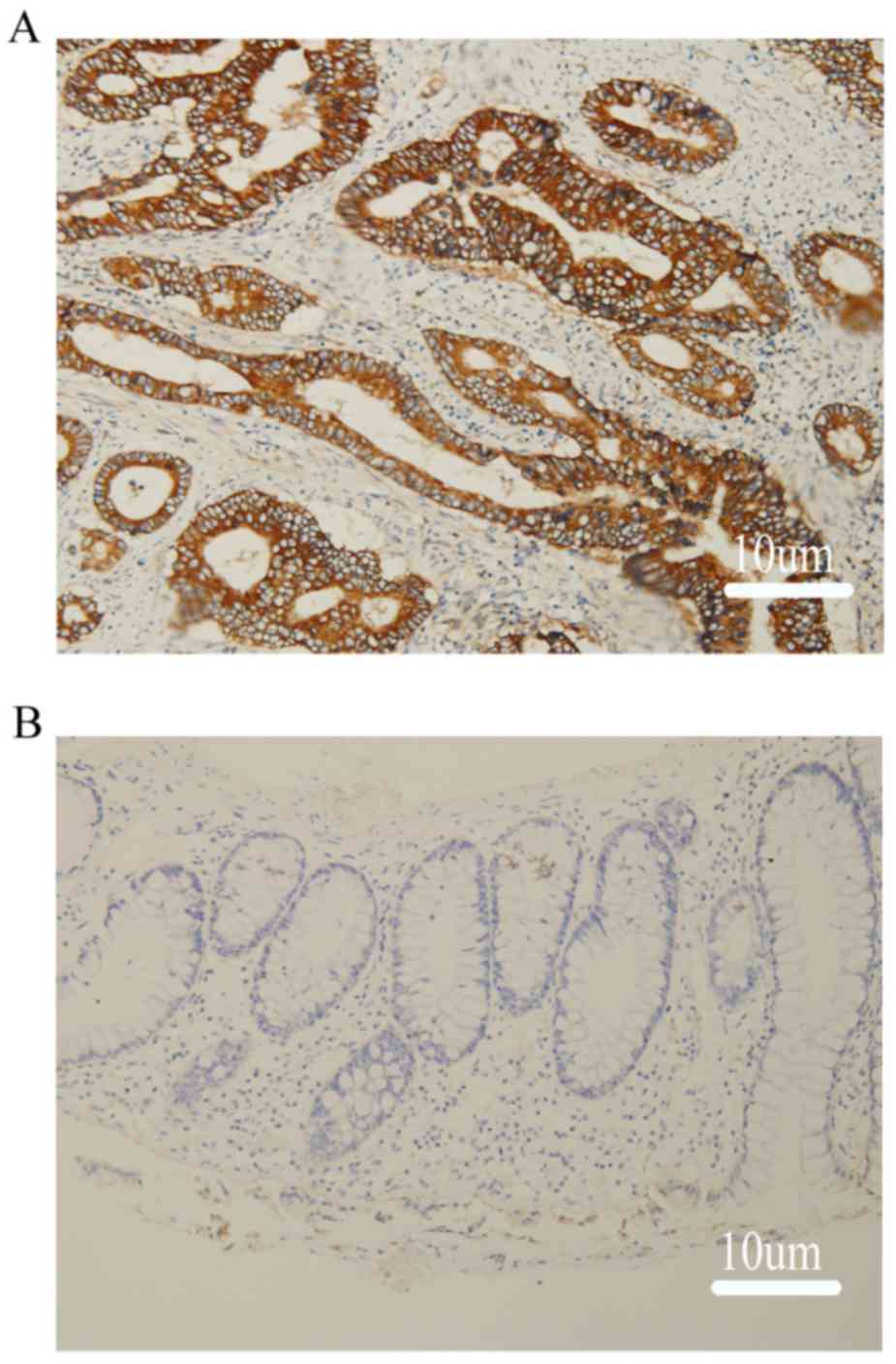 Patients with mCRC who had ever been administered cetuximab combined with first-line or later chemotherapy at our institution between January 1, 2005, and October 1, 2015, were identified. Although Cetuximab was first introduced into China in 2006, some people had enough money to buy cetuximab in 2005 in Hong Kong. That is why patients in the present study accepted cetuximab during 2005–2015. At first, 235 patients were enrolled, but only 68 patients with paraffin embedding tissue were available for immunohistochemical testing. All of the eligible patients in the present study satisfied the following requirements: i) intact medical data, ii) explicit pathological diagnosis of colon cancer, iii) at least two experts confirming metastasis based on clinical and imaging methods, iv) at least two cycles of palliative chemotherapy with or without first-line cetuximab and v) sufficient cancer specimens in the archives of the Tissue Bank to test HK2, PKM2 and LDHA expression. Furthermore, we collected negative margin specimens from most patients as normal tissue. Written informed consent was received from the sample donors, and approval was granted by the Institute Research Medical Ethics Committee of Sun Yat-sen University (Guangzhou, China). The basic clinical characteristics for all of the patients are reported in Table I.