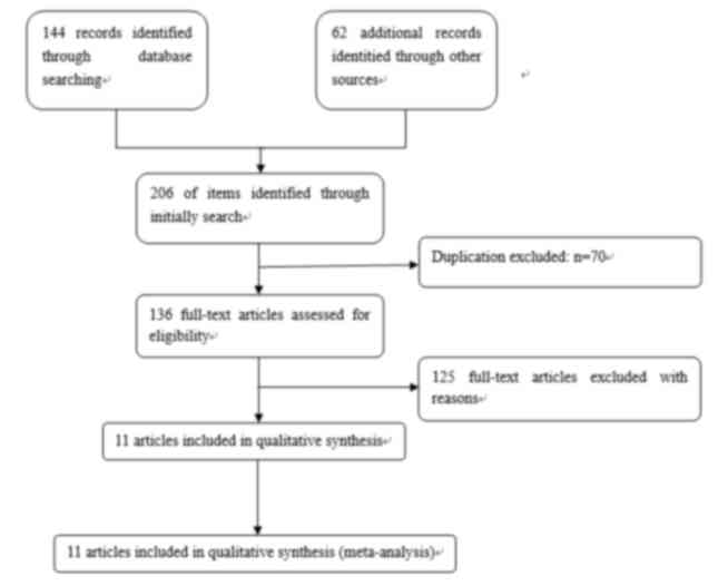 A total of 206 abstracts and titles were identified following all search strategies as described in Fig. 1. A total of 136 records were retained in the present study following rejection of replication errors in the included records. In total, 94 articles were excluded, as they did not meet the aforementioned inclusion criteria on the basis of the titles and abstracts. Of the remaining 42 studies, 18 additional articles were excluded due to the lack of a study control, 13 studies were excluded from the meta-analysis due to the lack of s-p53 detection in serum. The final 11 articles included in the present study met all inclusion criteria and were of good quality (Tables I and II).