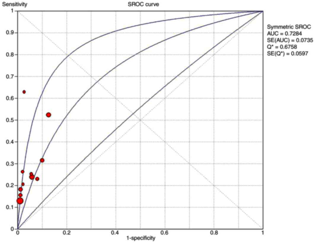 Meta DiSc statistical software (version 1.4; Universidad Complutense, Madrid, Spain) and STATA (version 14.0, Stata Corporation, College Station, TX, USA) were used to analyze the extracted data. The present study adopted standard methods previously recommended for the meta-analysis of diagnostic test evaluations (16). The sensitivity, specificity, positive and negative likelihood ratio (PLR and NLR), and 95% confidence intervals (CIs) were calculated with a random effects model according to the Mantel-Haensed method, as previously described (17). The diagnostic odds ratio (DOR) was determined using Moses' constant of linear method and was used to measure the accuracy, which indicates the change in diagnostic performance of the test under study per unit increase in the covariant (18). Summary receiver operating characteristic curves (SROC) were used to summarize overall test performance, and the area under the curve (AUC) was calculated. Additionally, the issue associated of sensitivities and specificities of 100% were solved by the default method of adding 0.5 to all cells within the diagnostic 2×2 table (16,19).