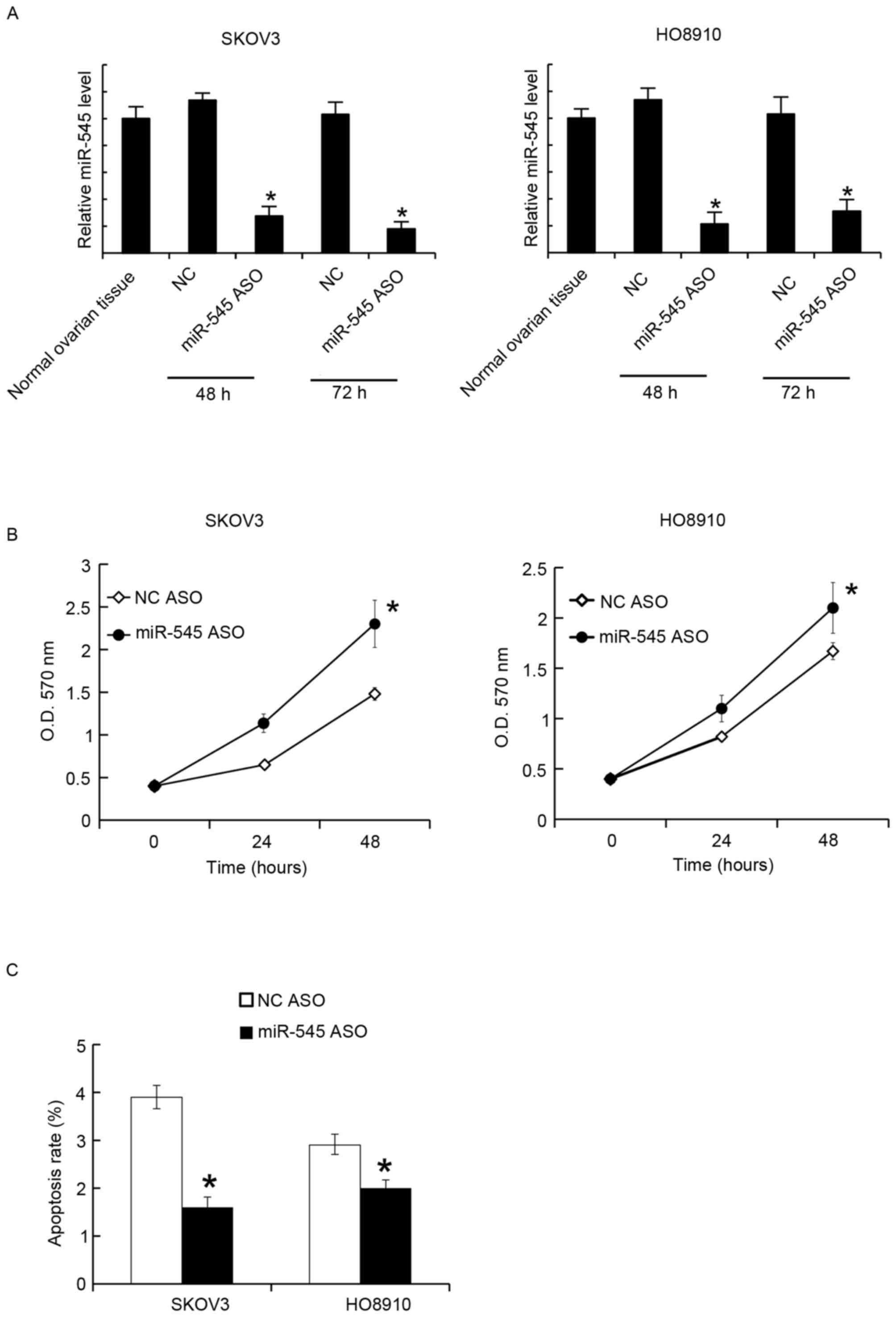 The miR-545 levels in SKOV3 and HO8910 were suppressed by miR-545 ASO transfection. After 48 and 72 h, the miR-545 levels were assayed using RT-qPCR. It was identified that miR-545 ASO significantly suppressed the miR-545 levels at the two time points (Fig. 3A). The MTT assay revealed that miR-545 ASO transfection promoted cellular proliferation in SKOV3 and HO8910 cells (Fig. 3B). Similarly, 48 h after transfection, the cell apoptosis rates were assessed using FACS analysis, and it was revealed that miR-545 ASO decreased the apoptosis rate in SKOV3 and HO8910 cells (Fig. 3C).