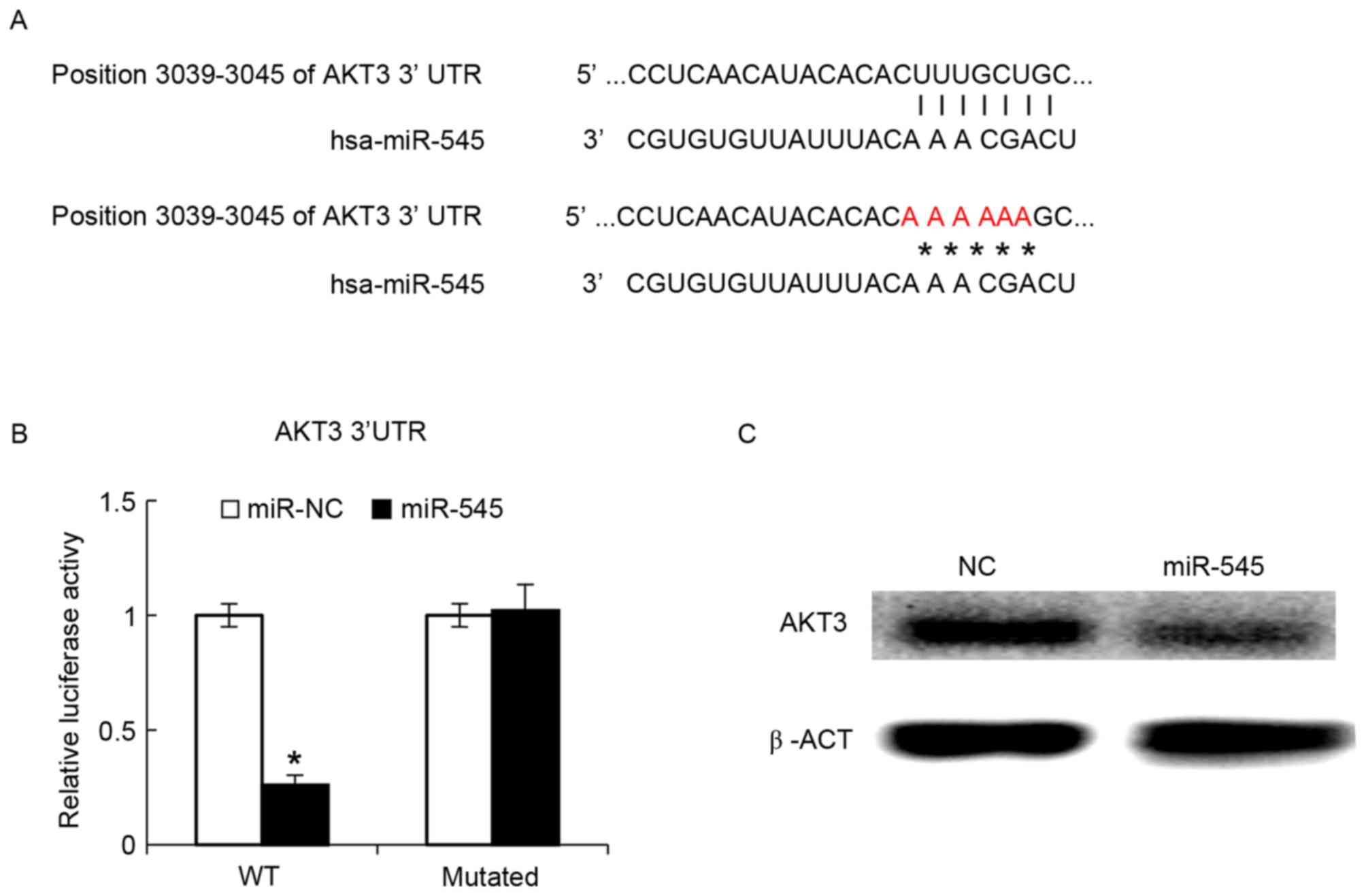 miRNAs have been demonstrated to be involved in the pathogenesis of EOC (30–32). A previous study by the authors revealed the function of miR-494 in EOC (33). The authors demonstrated that miR-494 was expressed at low levels in EOC tissues and cells. Overexpression of miR-494 inhibited the proliferation and migration of the EOC cells. miR-494 was revealed to target Myc proto-oncogene protein (34). In the present study, the function of miR-545 in EOC was analyzed and it was demonstrated that miR-545 served an antitumor function, and AKT3 was targeted by miR-545.