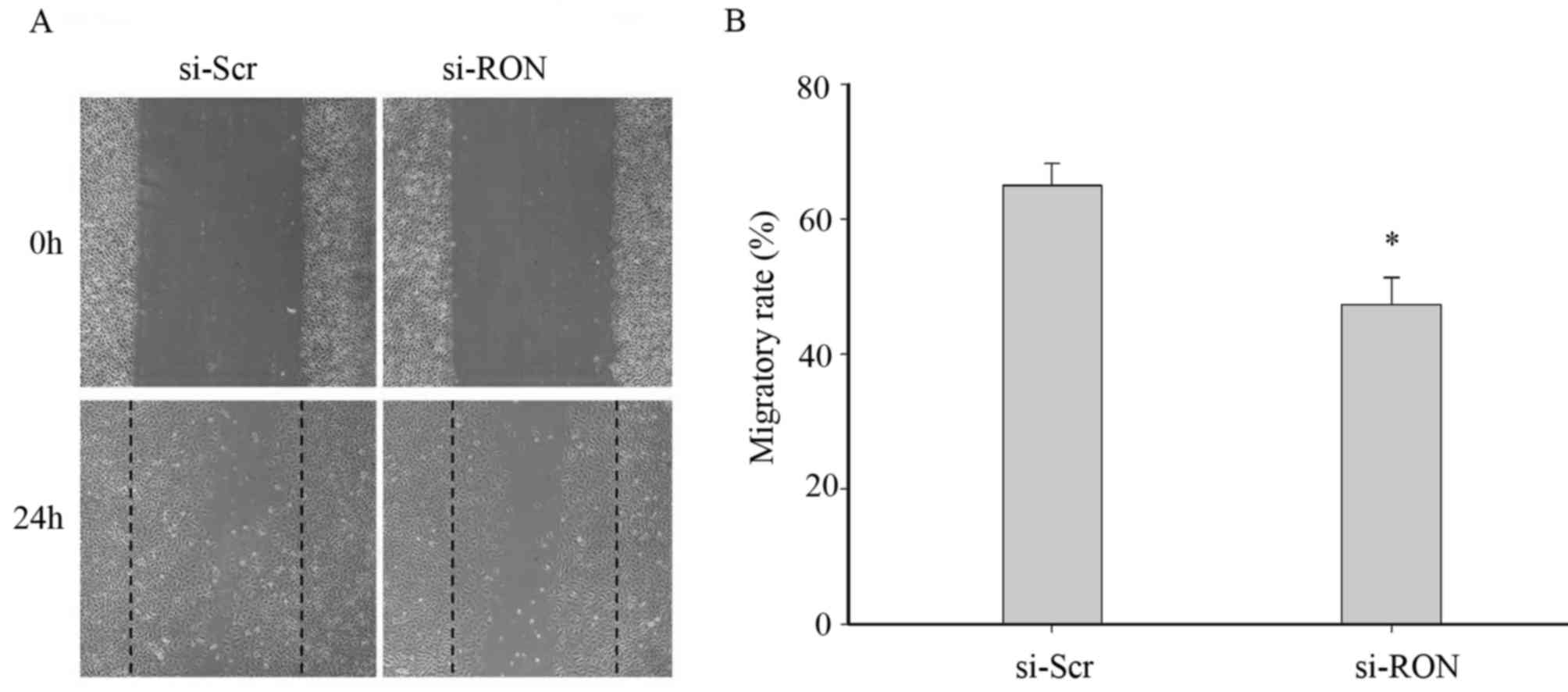 Cells from the si-RON and the si-Scr groups were incubated in RPMI-1640 with 10% FBS in 6-well plates. Following transfection with si-RON or si-Scr, a small wound area was produced in the 90% confluent monolayer using a 200-µl pipette tip in a lengthwise stripe. Following incubation at 37°C for 24 h, the area covered by migrated cells was examined under a light microscope (Nikon Corporation) and images were captured at ×100 magnification. Experiments were repeated in triplicate.