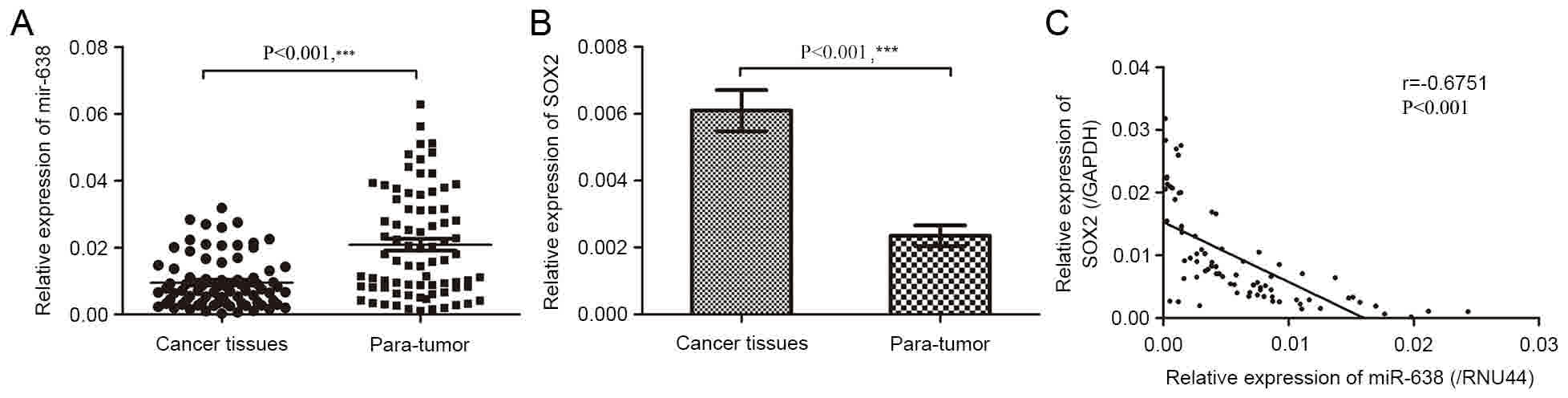 The aim of the present study was to investigate miR-638 and SOX2 expression in human HCC tissues and their matched non-cancerous tissues, and to assess their association with clinicopathological features. The results of the present study demonstrated that miR-638 was downregulated and that SOX2 was upregulated in HCC, with a significant inverse correlation. Furthermore, reduced miR-638 expression and elevated SOX2 expression was associated with tumor stage, portal vascular invasion and poor postoperative survival. Consequently, they may be regarded as potential biomarkers for predicting HCC progression and prognosis.