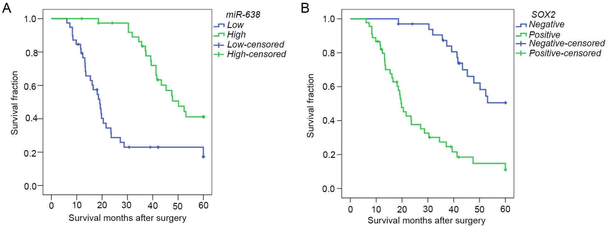 To observe whether miR-638 and SOX2 expression levels were correlated with clinicopathological features of HCC, clinicopathological analysis was performed (Table I). The data indicated that miR-638 and SOX2 were not significantly correlated with age, sex, tumor size, tumor number, serum a-fetoprotein (AFP) level, tumor differentiation (all P>0.05). By contrast, a significant association was observed between miR-638 or SOX2 expression and TNM staging (P=0.001 and 0.002, respectively). It was also demonstrated that patients with HCC with lower miR-638 expression and higher SOX2 expression were more likely to be at a higher portal vascular rate (P=0.005 and 0.012, respectively). The results from the present study suggested that miR-638 and SOX2 expression may serve a vital role in HCC progression and may have potential as novel prognosis biomarkers for HCC.