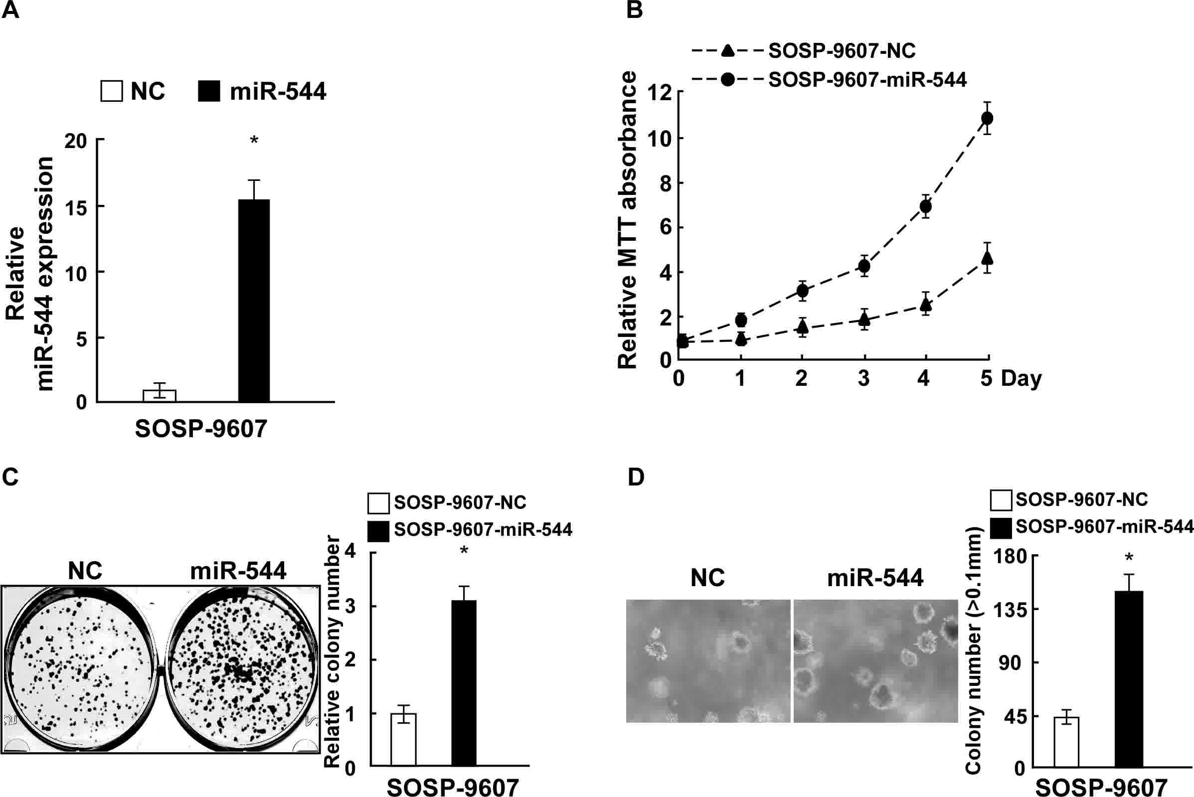 To explore the effect of miR-544 on OS cell proliferation, SOSP-9607 cells were transfected with miR-544 mimics, a miR-544-in or the respective controls, and the expression of miR-544 in the stably transfected SOSP-9607 cell line was confirmed by RT-qPCR (Fig. 2A). MTT and colony formation assays revealed that the overexpression of miR-544 increased the proliferation of SOSP-9607 cells, as compared with those cells transfected with negative control miRNA (Fig. 2B and C). Overexpression of miR-544 in SOSP-9607 cells also significantly enhanced their anchorage-independent growth ability (P<0.05; Fig. 2D). By contrast, SOSP-9607 cells were transfected with miR-544-in or the respective control, and the expression of miR-544 in the stably transfected SOSP-9607 cell line was confirmed by RT-qPCR (Fig. 3A). MiR544-in-transfected SOSP-9607 cells exhibited decreased proliferation rates, colony formation ability, and anchorage-independent cell growth ability, compared with in the negative control cells (Fig. 3B-D). Collectively, these data indicate that miR-544 acted as a tumor promoter to endorse OS cell proliferation.