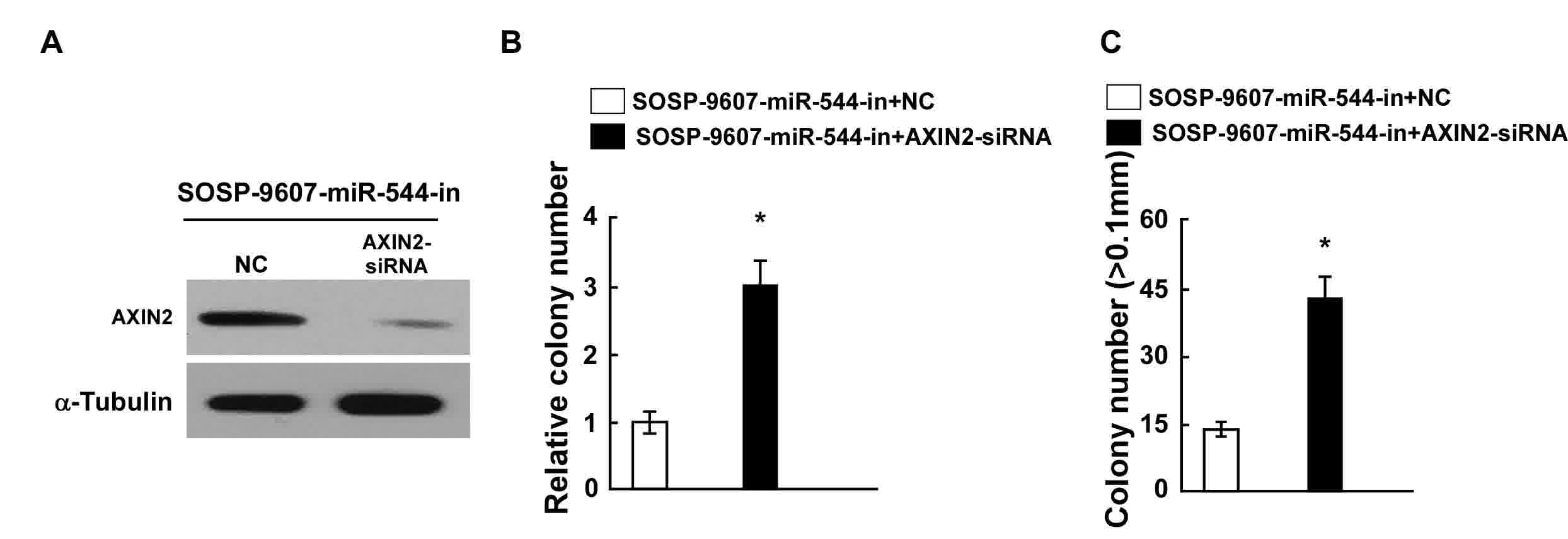 The effects of AXIN2 downregulation on proliferation were examined in OS cells transfected with miR-544-in. siRNA-mediated knockdown of AXIN2 was performed in miR-544-in-transfected SOSP-9607 cells, and confirmed through western blotting (Fig. 5A). Results from the colony formation and anchorage-independent growth assays indicated that the suppression of AXIN2 expression by AXIN2-siRNA reversed the effects of miR-544-in in SOSP-9607 cells (Fig. 5B and C). Taken together, these results demonstrated that the downregulation of AXIN2 counteracts the cell proliferation arrest induced by miR-544-in.