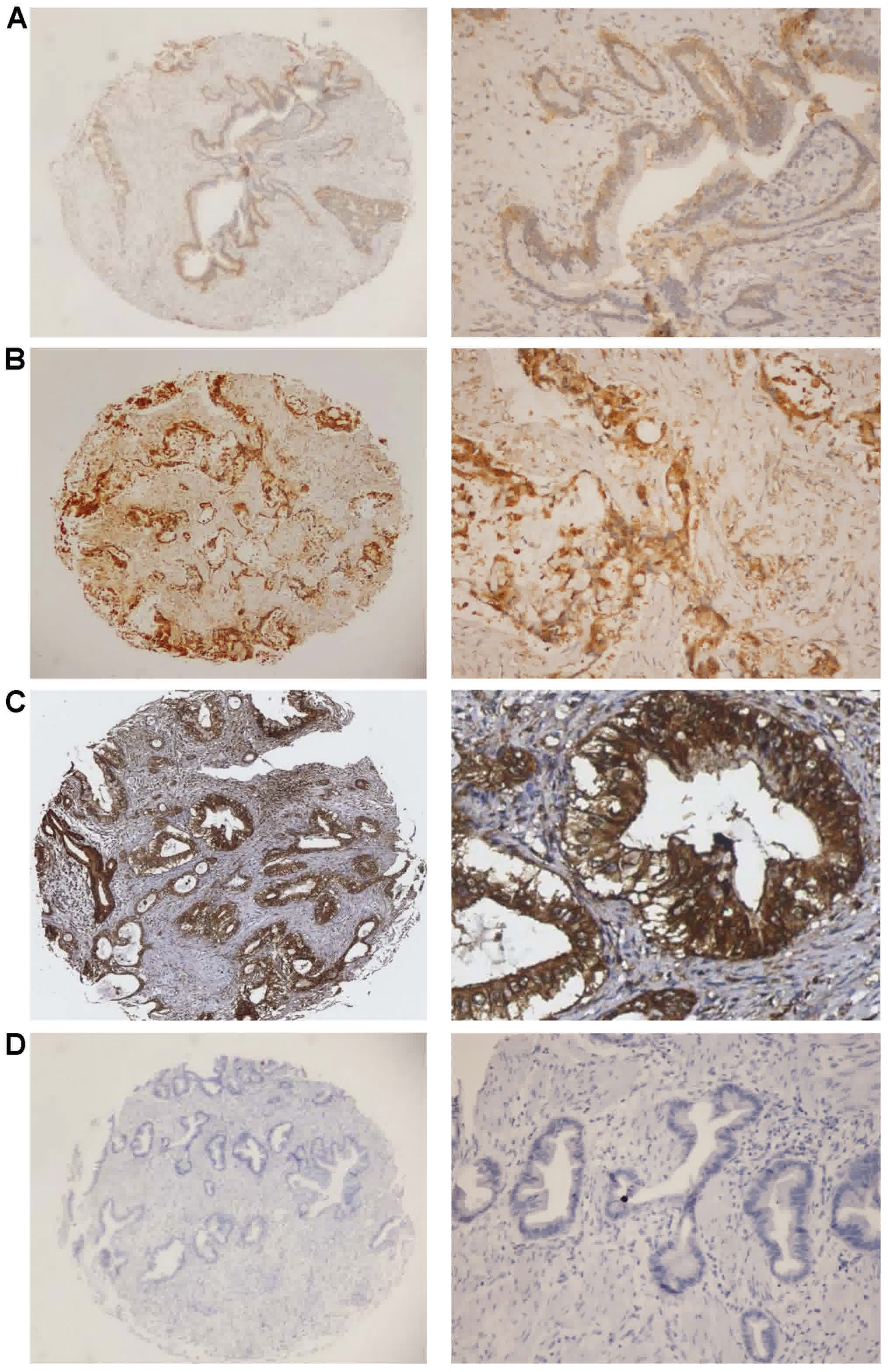 Tissue microarray blocks of benign diseases and tumor tissue specimens were constructed using a manual arrayer (Beecher Instruments, Sun Prairie, WI, USA). Each block had at least one 1.5-mm core of nonneoplastic mucosal tissue and two 1.5-mm cores of primary tumor tissue (25). All the tissue specimens in the present study were obtained with written informed consent and the use of the tissues and clinical information was approved by the Eastern Hepatobiliary Hospital and Changhai Hospital Institutional Review Boards.