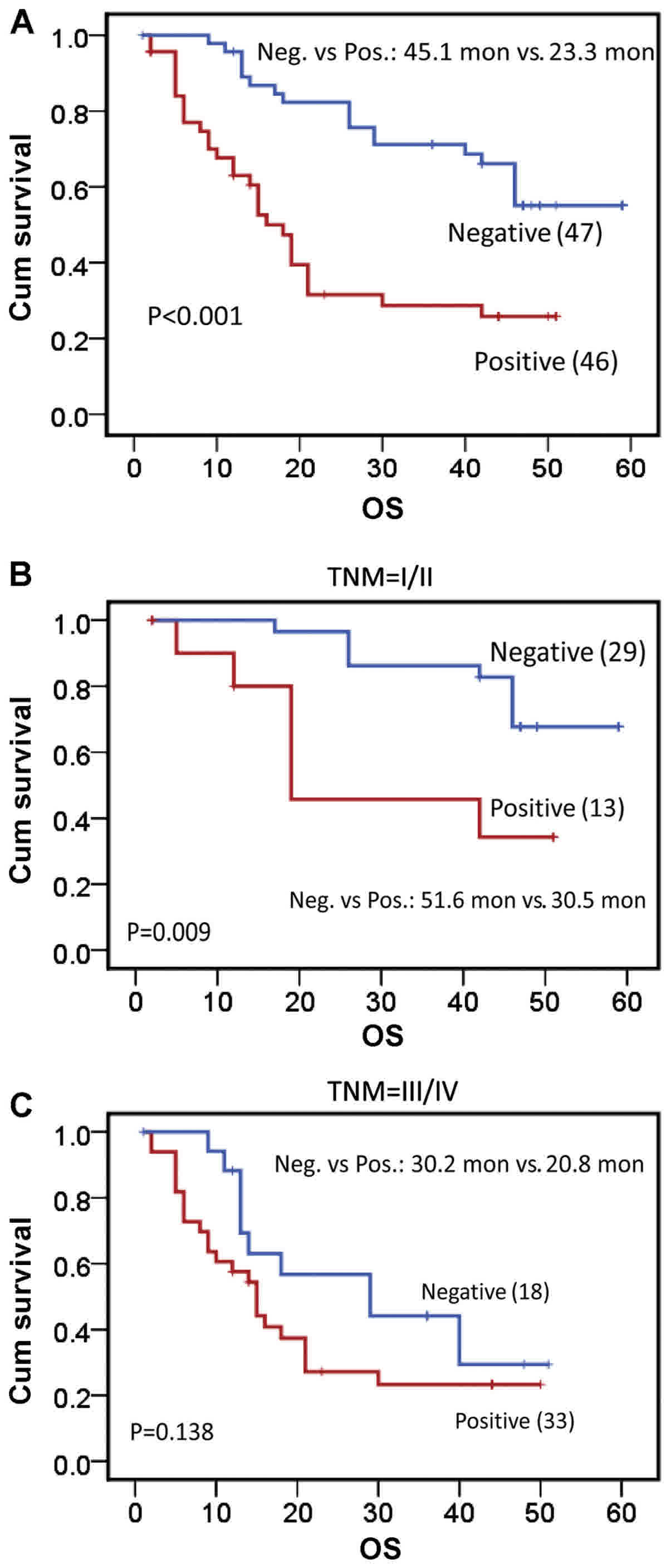 The median cumulative overall survival in patients with resected ICC was 33 months. Kaplan-Meier analyses revealed that the ICC patients with positive PPA1 expression had a poor prognosis compared with those with negative PPA1 expression (P<0.001; Fig. 2A). Furthermore, subgroup analysis of PPA1 expression according to TNM stage was performed. The outcome of patients with PPA1-positive expression was worse in those with stage I/II disease than in those without PPA1 expression with stage I/II disease (51.6 vs. 30.5 months; P=0.009; Fig. 2B). In patients with stage III/IV disease, patients with PPA1-positive expression tended to have a worse outcome than those without PPA1 expression, but this difference was no statistically significant (30.2 vs. 20.8 months; P=0.138; Fig. 2C). Additionally, univariate analysis revealed that all other factors were significantly associated with patient overall survival (Table II), including gender (P<0.001), tumor size (P=0.008), positive tumor margins (P<0.001), T stage (P<0.001), regional lymph node metastasis (P<0.001), TNM stage (P<0.001) and differentiation (P<0.001). Subsequent multivariate analysis using the Cox proportional hazards model demonstrated that T stage was an independent prognostic indicator of OS in patients with ICC (Table II).