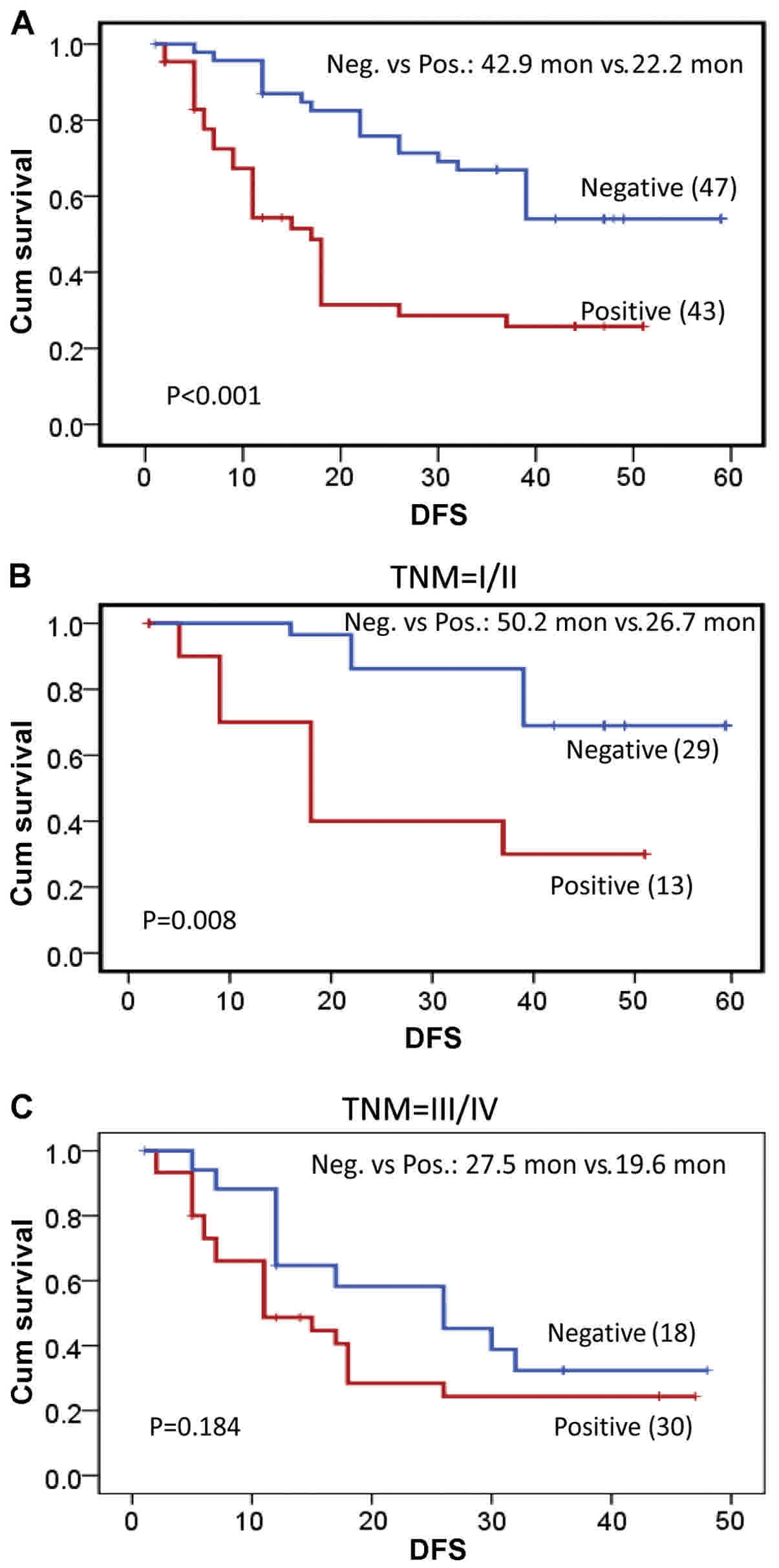 Among the 93 patients with ICC, 90 experienced recurrence following resection. Patients with PPA1-positive tumors exhibited higher chanceto recurrence compared with those with PPA1-negative tumors (P<0.001; Fig. 3A). Furthermore, in patients with stage I/II disease, Kaplan-Meier survival analyses according to TNM stage revealed that those with PPA1-negative tumors exhibited a significantly longer disease-free survival (DFS) than those with PPA1-positive tumors (50.2 vs. 26.7 months; P=0.008; Fig. 3B). However, this difference was not statistically significant in patients with stage III/IV disease (PPA1-negative vs. PPA1-positive: 27.5 vs. 19.6 months; P=0.184; Fig. 3C). In addition, the univariate analysis revealed that age (P=0.011), sex (P=0.005), tumor size (P=0.003), positive margin (P<0.001), T stage (P<0.001), lymph node metastasis (P<0.001), disease stage (P<0.001) and differentiation (P<0.001) were significant predictors of tumor recurrence (Table III). Multivariate analysis using the Cox proportional hazards model demonstrated that PPA1 expression, T stage and differentiation were independent predictors of tumor recurrence (Table III).