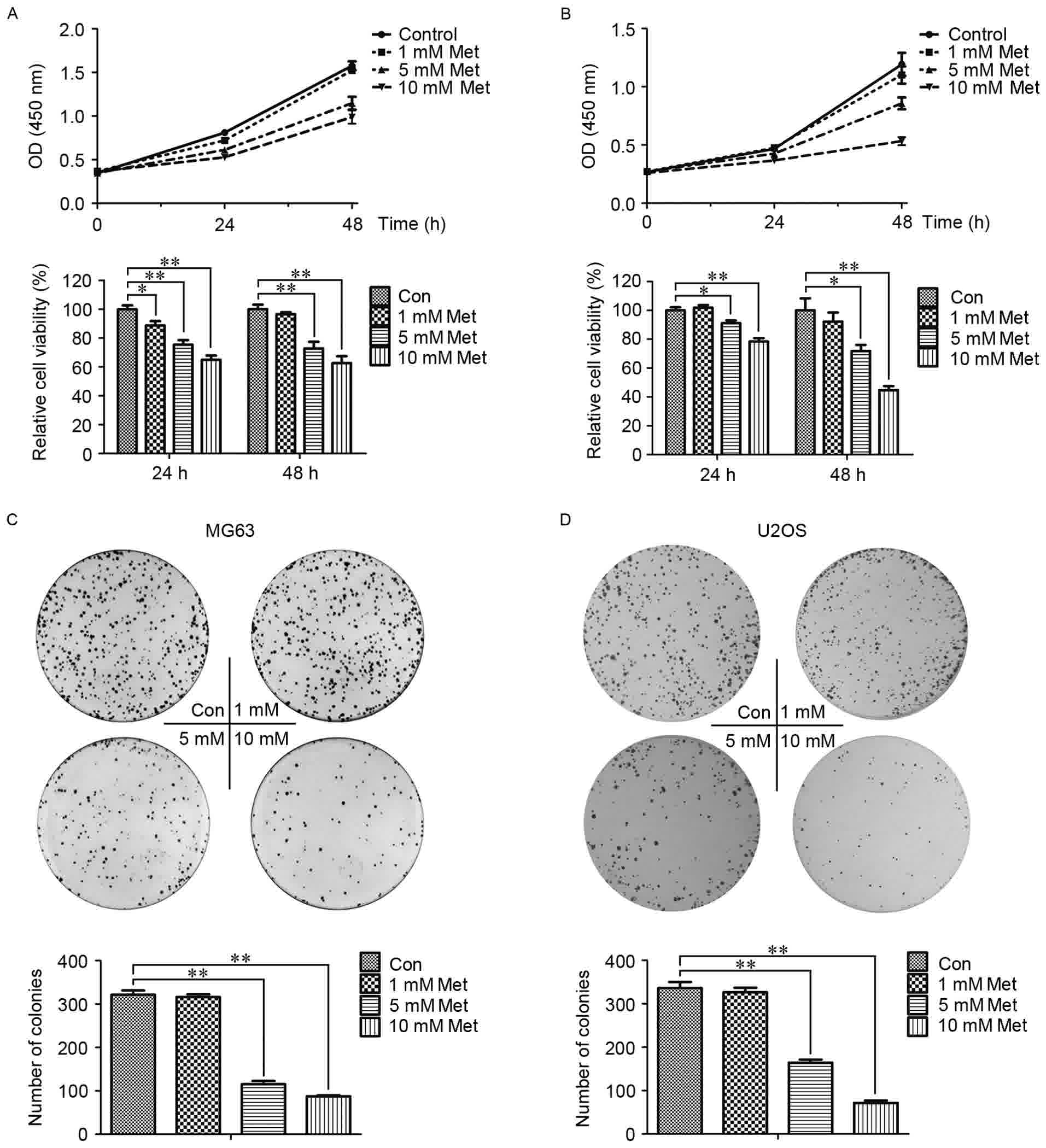 To evaluate the effect of Met on OS cells, the viability of MG63 and U2OS cells treated with 1, 5 and 10 mM Met was determined in comparison to a control group. The cell viability was inhibited more significantly in the 10 mM Met group than in the other treatment groups, and the inhibitory effects increased in a dose- and time-dependent manner. Additionally, the colony formation capability was decreased upon treatment with Met.