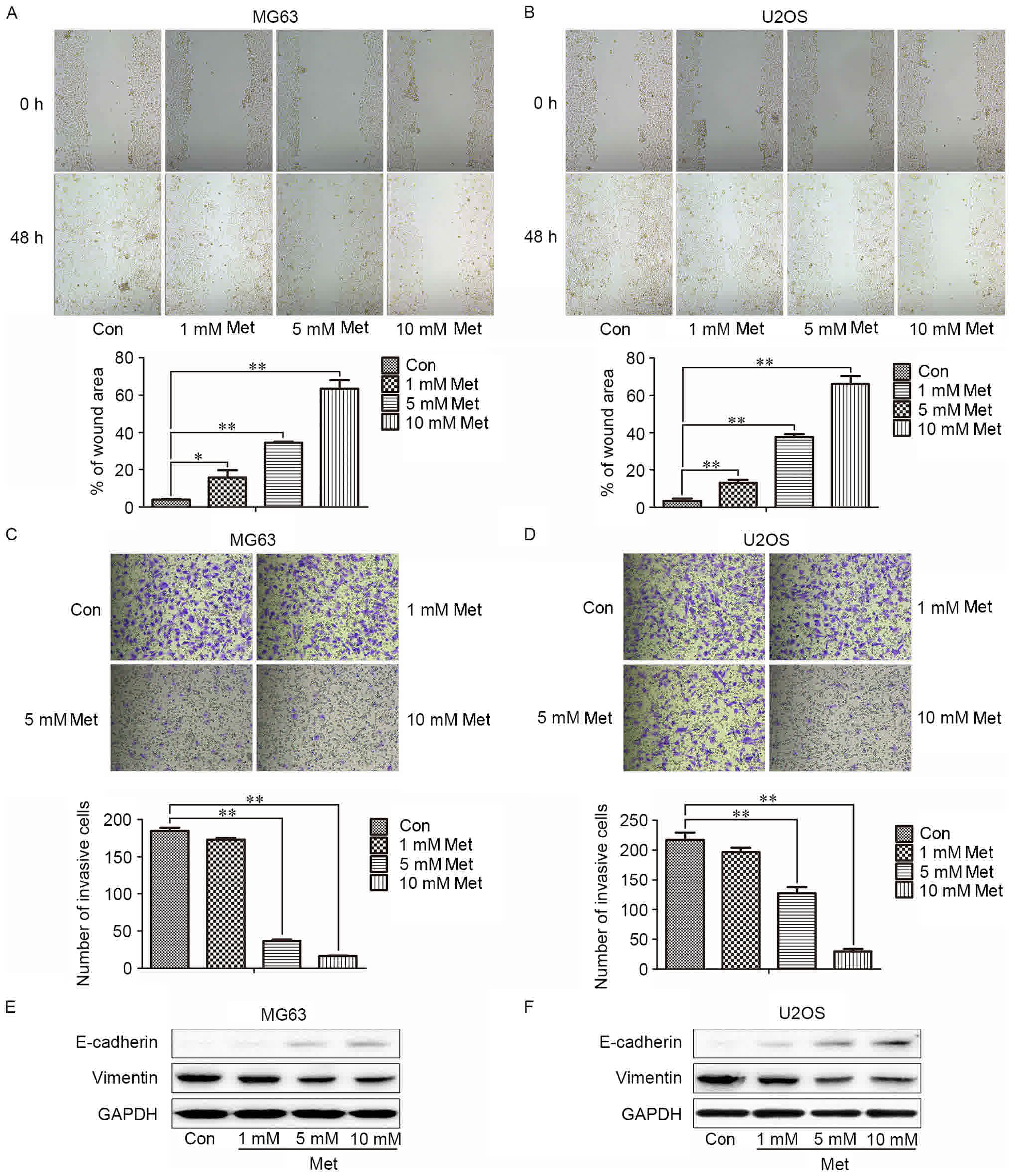 As OS frequently metastasizes, strategies for inhibiting metastasis may be critical for treating this malignancy. Met has been reported to suppress the metastasis-associated behaviors of migration and invasion in certain types of malignancy (29,30); however, to the best of our knowledge, whether Met affects these behaviors in OS has yet to be determined. Therefore, the present study evaluated the anti-metastatic effects of Met in MG63 and U2OS cells using wound-healing and invasion assays with a range of doses of Met. Similar to the previous studies, the ability of OS cells to migrate and invade was inhibited, particularly following treatment with 10 mM Met.