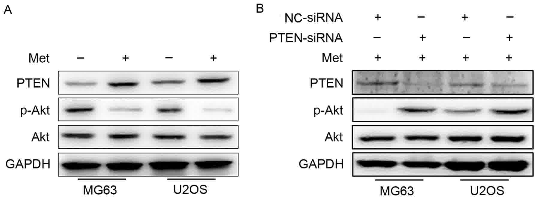 To provide further confirmation that Met exerts its function through the PTEN/Akt pathway, MG63 and U2OS cells were transfected with NC- or PTEN-siRNA prior to Met treatment, and western blotting was performed. The expression of PTEN was confirmed to be lower, and the phosphorylation of Akt, higher, in cells transfected with PTEN-siRNA compared with NC-siRNA-transfected cells (Fig. 3B).