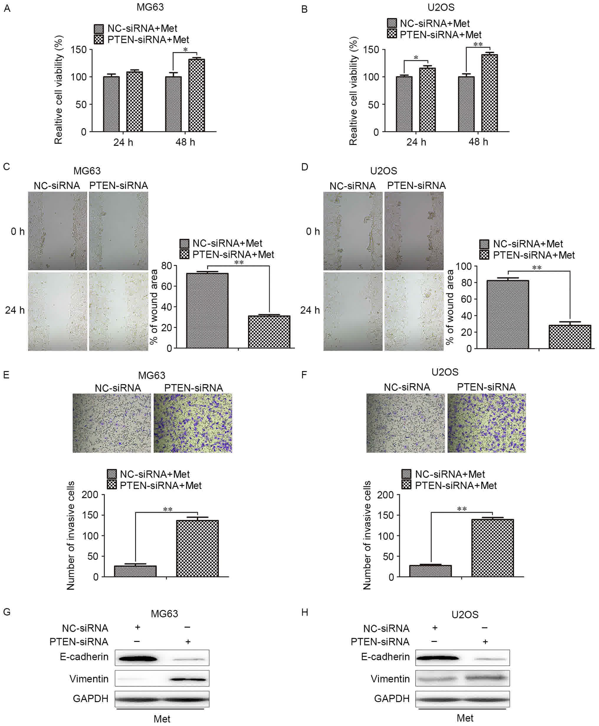 The human OS MG63 and U2OS cell lines were obtained from the American Type Culture Collection (Manassas, VA, USA). Cells were cultured in DMEM medium supplemented with 10% fetal bovine serum (FBS), 100 µg/ml penicillin and 100 µg/ml streptomycin (all Thermo Fisher Scientific, Inc., Waltham, MA, USA) in a 5% CO2 atmosphere at 37°C. Met (1,1-dimethylbiguanide hydrochloride) was purchased from Sigma-Aldrich (Merck KGaA, Darmstadt, Germany). The Cell Counting kit-8 (CCK-8) was purchased from Nanjing KeyGen Biotech Co., Ltd. (Nanjing, China). Antibodies against β-actin (cat. no. sc-47778), Akt (cat. no. sc-8312), phosphorylated (p)-Akt (cat. no. sc-33437) and phosphatase and tensin homolog (PTEN) (cat. no. sc-6817-R) were purchased from Santa Cruz Biotechnology, Inc. (Dallas, TX, USA), and anti-E-cadherin (cat. no. ab1416) from Abcam (Cambridge, UK); vimentin (cat. no. 10366-1-AP) was purchased from ProteinTech Group, Inc. (Chicago, IL, USA); the goat anti-rabbit (cat. no. 32460) and goat anti-mouse (cat. no. 32430) horseradish peroxidase (HRP)-conjugated secondary antibodies were purchased from Thermo Fisher Scientific, Inc.