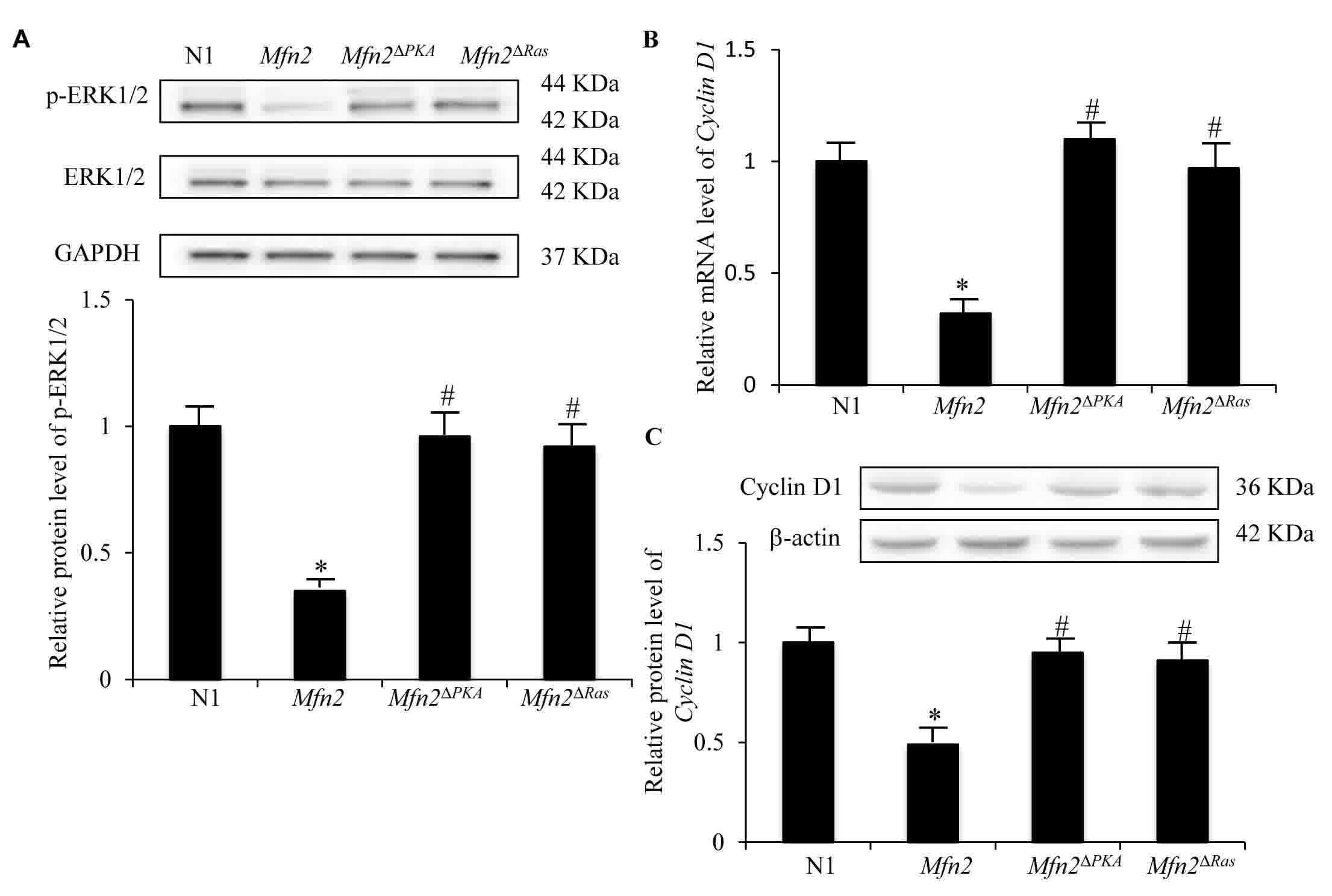 It has been established that Ser442 of Mfn2 is a protein kinase A (PKA) phosphorylation site (4). The PKA site of Mfn2 is essential for Mfn2-mediated inhibition of ERK1/2 signaling, and the consequent anti-proliferative effect, in rat VSMCs (16). In order to evaluate the importance of the PKA site of Mfn2 in human breast cancer, MCF-7 cells were transfected with plasmids containing the Mfn2 ORF with a PKA phosphorylation site deletion (Mfn2ΔPKA). A total of 48 h post-transfection, the mRNA and protein expression levels of Mfn2 in MCF-7 cells transfected with Mfn2ΔPKA plasmids were not significantly different to those of MCF-7 cells transfected with Mfn2 full length plasmids (Fig. 2A and B). However, the proliferation (Fig. 2C), migration (Fig. 2E) and invasion (Fig. 2F) abilities of MCF-7 cells transfected with Mfn2ΔPKA plasmids were markedly increased compared with cells transfected with Mfn2 full length plasmids (P<0.05). Cell cycle arrest was also rescued (Fig. 2D). This indicates that the PKA phosphorylation site was necessary for the anti-proliferation, anti-migration and anti-invasion functions of the Mfn2 protein. Furthermore, the expression levels of p-ERK1/2 (Fig. 3A) and Cyclin D1 (Fig. 3B and C) were significantly increased in MCF-7 cell transfected with Mfn2ΔPKA plasmids compared with those in MCF-7 cells transfected with Mfn2 full length plasmids (P<0.05). These data indicate a crucial role of the PKA phosphorylation site of Mfn2 in the inhibition of the Ras-ERK1/2-Cyclin D1 pathway.