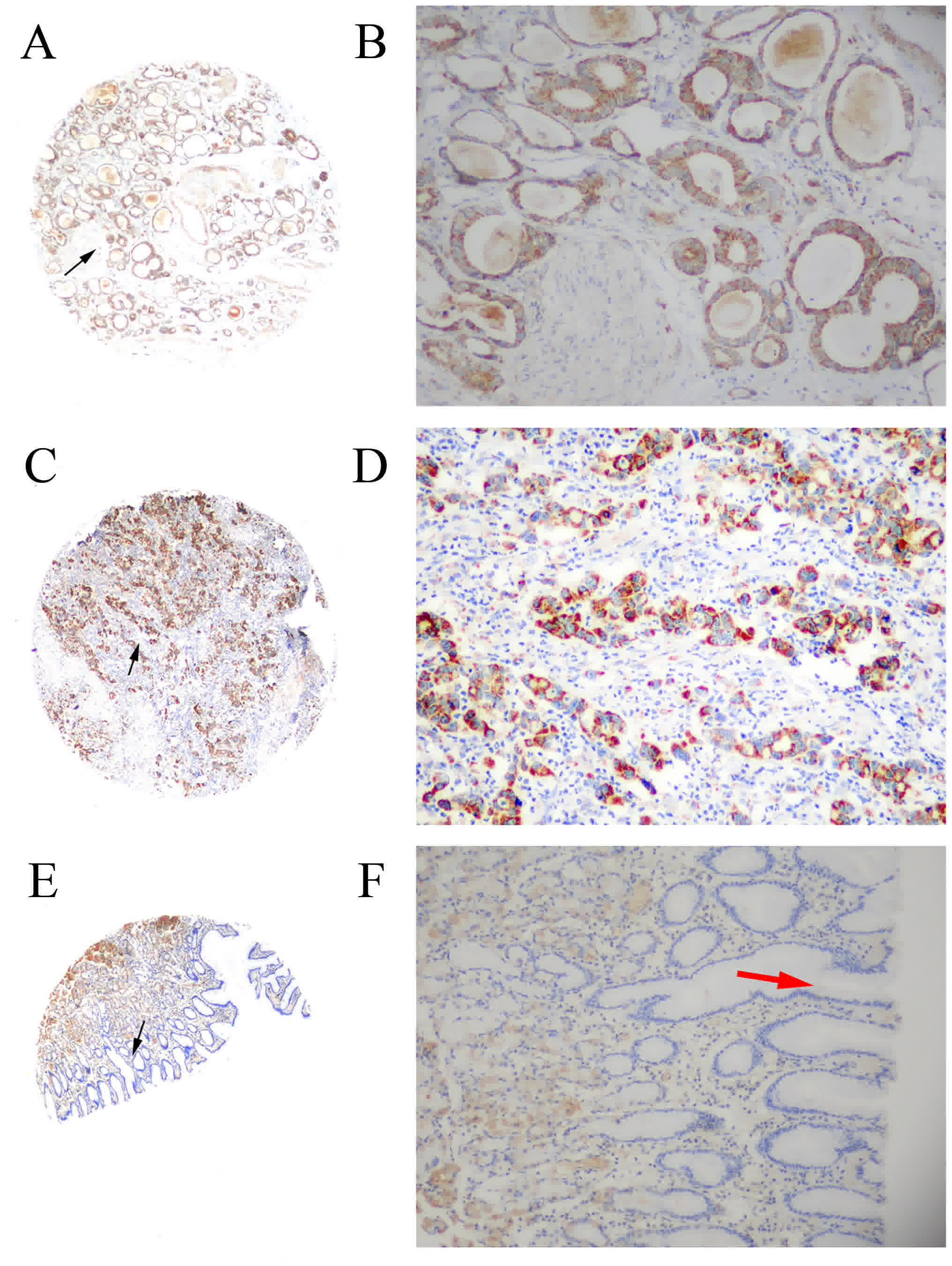 Tissue microarray (TMA) blocks containing a total of 528 cases (436 cancer tissue samples and 92 non-cancerous tissue samples) were constructed by reviewing the core area of tumor region from the hematoxylin and eosin-stained slides by two independent pathologists and selecting one representative FFPE archival block for each case. Core tissue biopsies (2 mm in diameter) were obtained from individual FFPE blocks (donor blocks) and arranged in recipient paraffin blocks (TMA blocks) using a trephine.