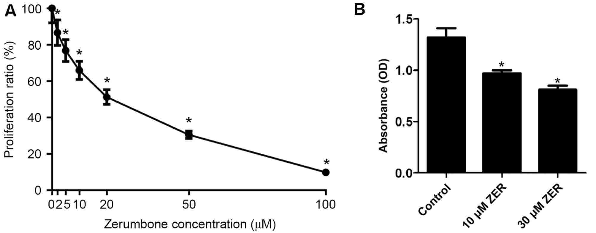The effect of zerumbone on cancer cell invasion by was investigated using a transwell invasion assay. As shown in Fig. 3B, the cell invasion rate in the zerumbone-treated groups was significantly lower than those in the control group.