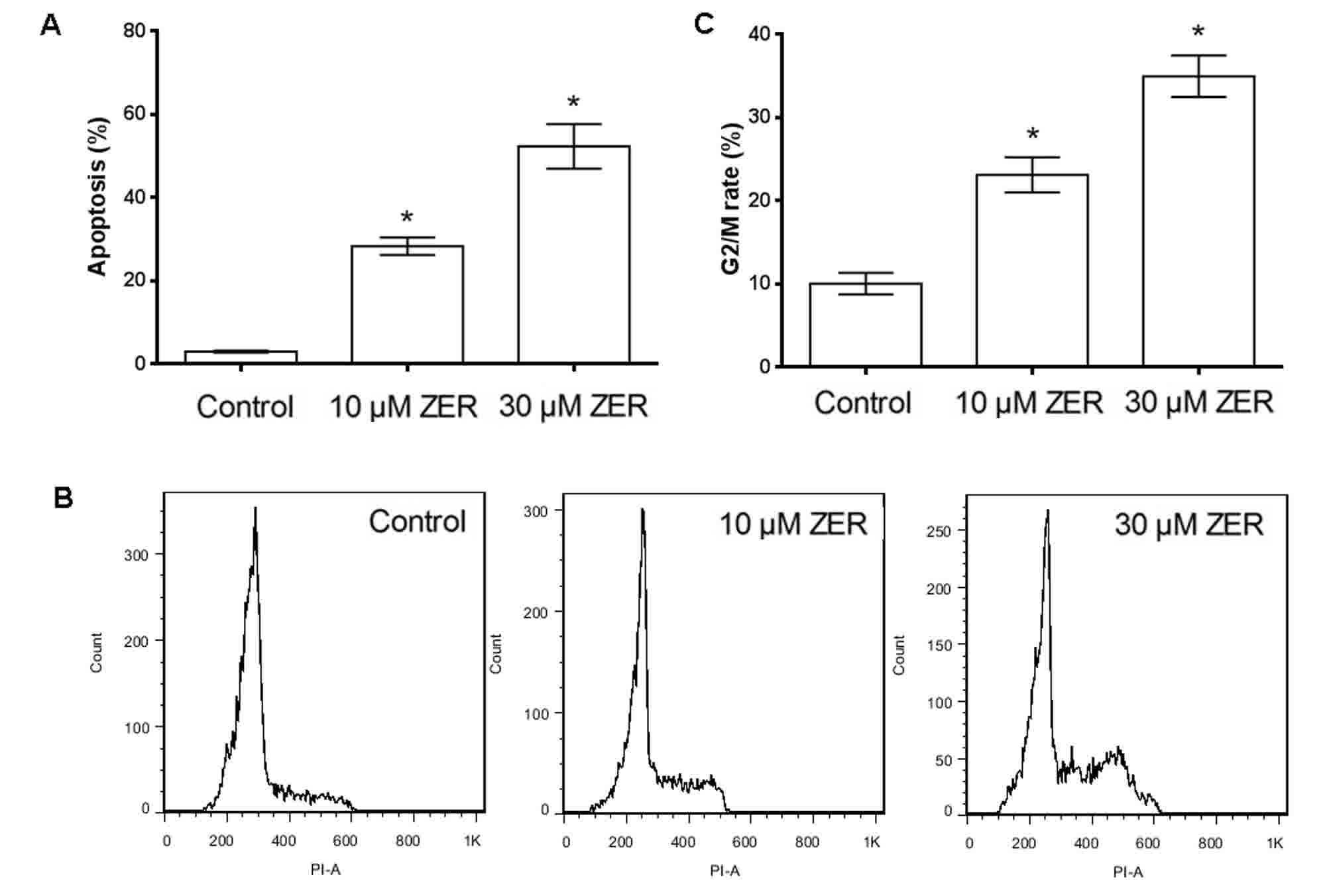 Cell cycle analysis by flow cytometry showed treatment with 10 or 30 µM zerumbone for 48 h increased the proportion of cells in G2/M phase (from 10.05±0.13 to 23.1±0.21 or 34.96%±0.25 following 10 or 30 µM zerumbone treatment, respectively) (Fig. 2B and C). These results indicated that zerumbone induced cell cycle arrest at G2/M in HepG2 cells in a concentration-dependent manner.