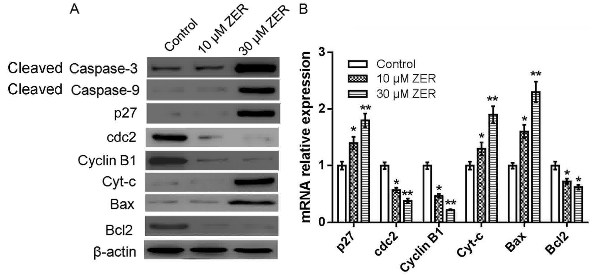 The caspase cascade triggered by caspase family members, among them the frequently activated death proteases caspase-3 and-9, serves a key role in apoptosis (14). To investigate whether caspase activation was involved in zerumbone-induced apoptosis, activation of caspase-3 and-9 was detected by western blotting. As shown in Fig. 4A, HepG2 cells treated with zerumbone markedly increased the expression level of cleaved caspase-3 and-9, compared with the control cells. Other apoptosis-and cell cycle-associated genes in HepG2 cells were also investigated by western blotting and RT-qPCR. As shown in Fig. 4, compared to the control, zerumbone treatment significantly increased the expression level of p27, Bax, and cytochrome-c, but decreased the expression level of CDC2, cyclinB1 and Bcl-2. These results indicated that zerumbone induced the activation of caspase-3, caspase-9, cytochrome-c and Bax, and decreased the expression level of Bcl-2, eventually leading to the apoptosis in HepG2 cells.