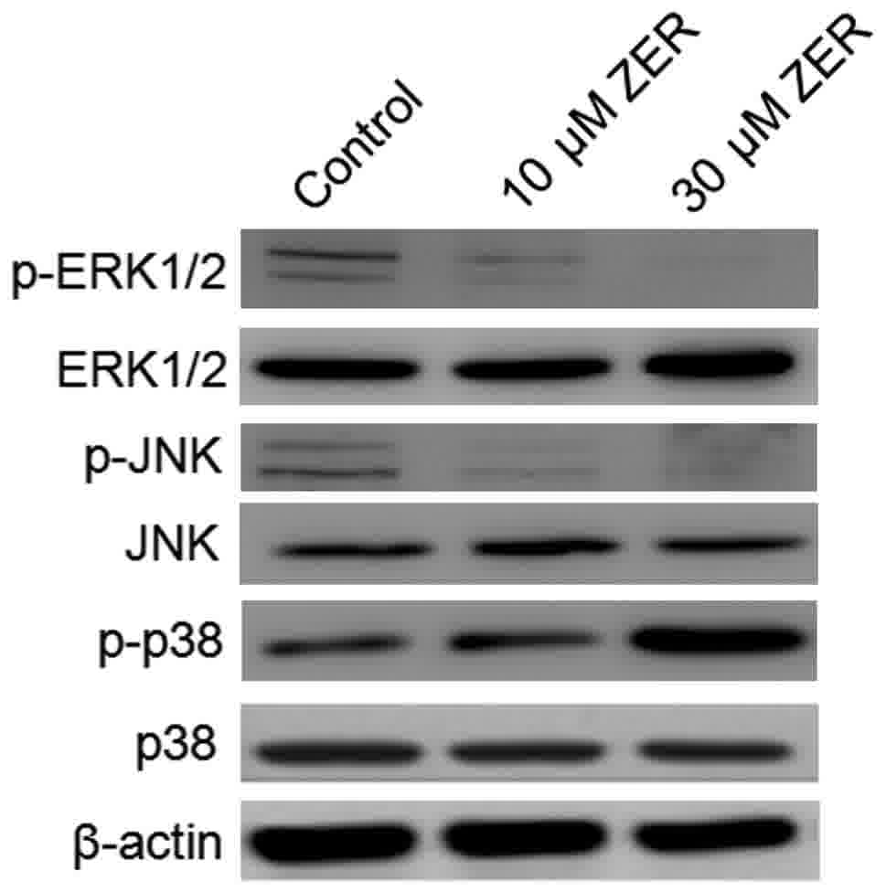 The MAPK pathways serve a notable role in mediating the survival of mammalian cells and tumor metastasis (27). The MAPK family includes JNK, p38 MAPK and ERK. p38 MAPK phosphorylation has been implicated to serve a notable role in cell apoptosis, and activation of p38 MAPK decreases ERK1/2 activity (28). The results of the present study demonstrated that the phosphorylation of P38 MAPK was upregulated and phosphorylation of ERK1/2 was downregulated following zerumbone treatment of HepG2 cells but did not exhibit a significant influence on total JNK protein expression. These results indicated that regulation of ERK1/2 and p38 MAPK serves a critical role in restraining cancer cells from invasion and metastasis and inducing apoptosis and cell cycle arrest in response to zerumbone treatment in HepG2 cells.
