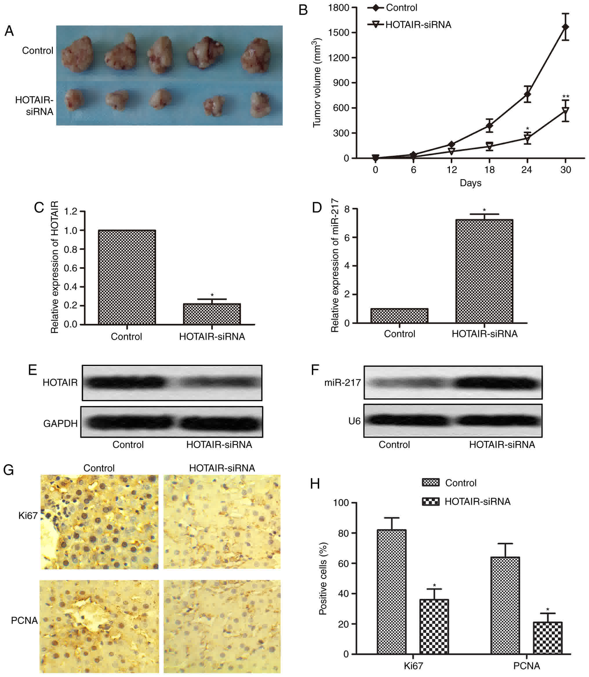To further determine whether inhibition of HOTAIR could suppress the progression of liver cancer, an in vivo tumor model injected with HepG2 cells or HOTAIR-siRNA cells was used. Tumor volumes were measured every 6 days until the 30th day following cells injection. Five representative tumors from each group at 30th day were photographed and shown in Fig. 7A. The tumors volumes in HOTAIR-siRNA group were significantly smaller than that in control group (Fig. 7B). We then measured the expression of HOTAIR and miR-217 in the tumor tissues, and the results showed that the expression of HOTAIR was markedly reduced, while the expression of miR-217 was significantly increased in HOTAIR-siRNA tumor tissues as compared with control tumor tissues (Fig. 7C-F). In addition, we further performed immunohistochemistry assay to check the expression of Ki67 and PCNA in the tumor tissues. As shown in Fig. 7G and H, compared with control tumor tissues, Ki67 and PCNA positive cells had an obvious reduction in HOTAIR-siRNA tumor tissues. These in vivo results together with in vitro results suggest that inhibition of HOTAIR suppresses tumor growth by regulating the expression of miR-217.