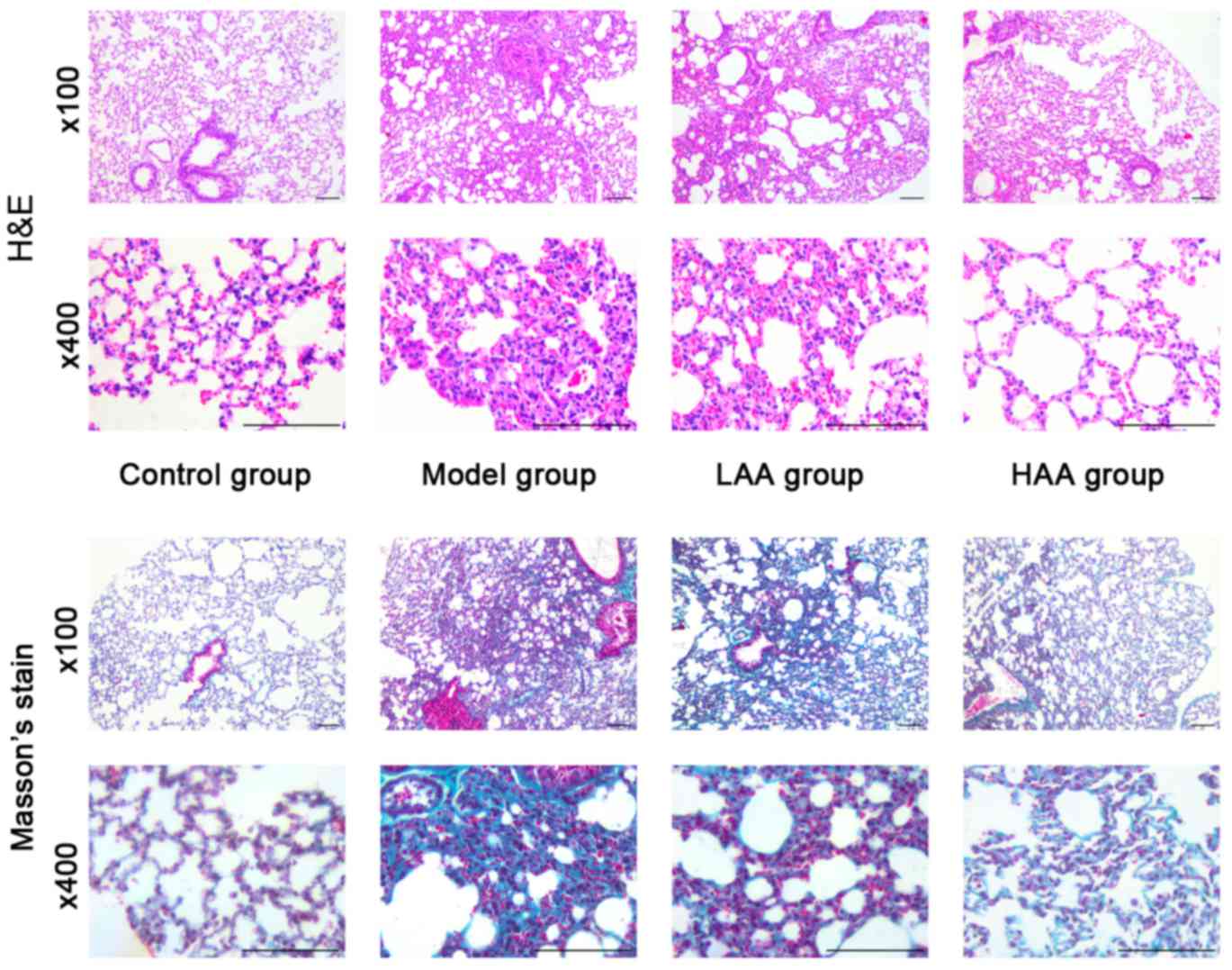 In the model group, the lungs were pale and stiff, and were harder compared with lungs from the control group following treatment for 6 weeks with HOCl (Fig. 1). In addition, amongst the groups treated with AA, the LAA and HAA groups had softer and more flexible lungs compared with the model group, indicating elasticity was rescued in these lungs. The effect of AA on remodeling of the lung tissue in SSc mice was assessed based on histopathological examination. Lungs in the model group exhibited thickening of their alveolar walls, broadening of their septum and infiltration of inflammatory cells as shown in Fig. 1. However, this inflammation was not observed in either the LAA or HAA groups. Based on Masson's stain, there was also less collagen fiber deposition in the lungs of AA-treated mice. Furthermore, the lung structure in the HAA group was more similar to normal lungs compared with the model group.